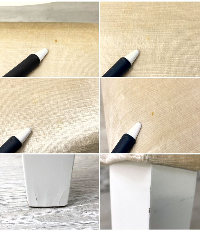 フレームに細かな傷やそれに伴うペイントロス、表面塗装の軽微な割れがあり、ファブリックにも薄い染みが複数見受けられます。