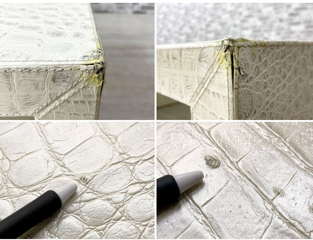 天板に軽微な打痕が数か所、角の一部にやや目立つ打痕、それに伴う革の破れがございます。多少のダメージはございますがお使い頂く上での問題は無く、今後も安心してお使い頂けるコンディションを保っております。