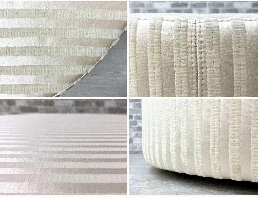 こちらの『 ドミノ Domino ラウンドスツール 』は、直径60cmのラウンド型座面に対し、質感の異なるストライプ柄ファブリックにより表情を加えています。スツール単体としてのご使用は勿論、ソファと合わせてオットマンとしてお使い頂く事も可能。明色で統一された空間に対しても、空間の印象を和らげる丸みとストライプによるアクセントをバランス良く加えてくれます。