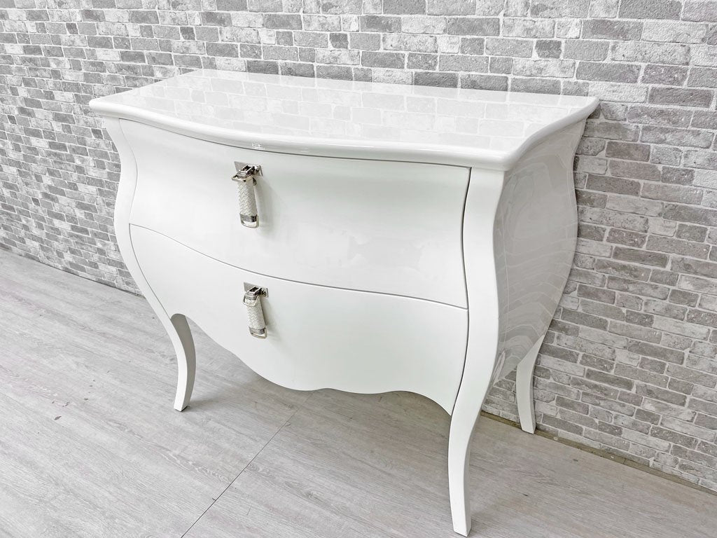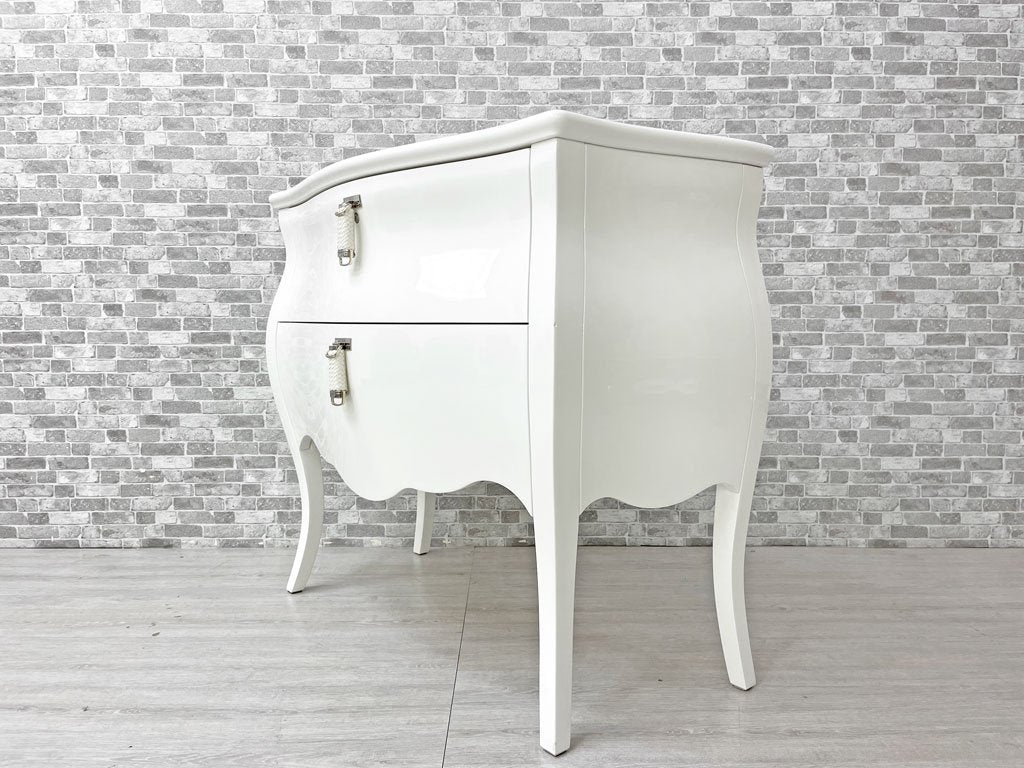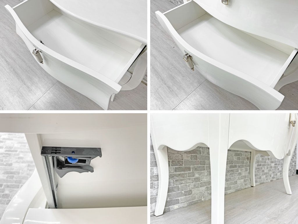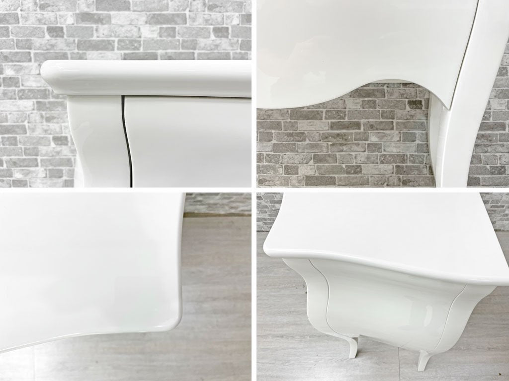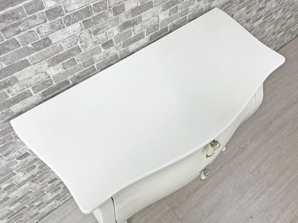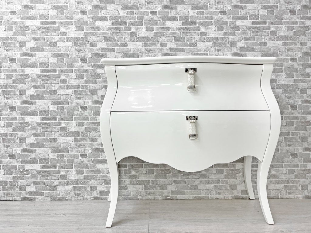 こちらの『 カノーヴァ Canova 2段チェスト コンソール 』は、従来の直線的なチェストとは異なり、曲線的なフォルムにあわせて引き出し前部も曲面で仕上げた手の込んだ造り。艶感のあるホワイト塗装が立体感をより強調しています。