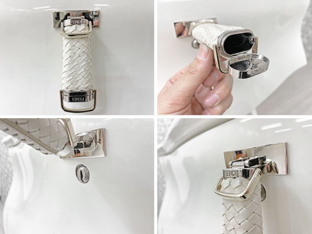 ハンドルには冊切りのレザーを丁寧に編み込んだイントレチャートを採用し、メタルカラーの金属も相俟って、目を惹くアクセントとして完成しています。今回鍵は残念ながら欠品しているものの、長ハンドルの先端は鍵を収納出来る蓋式になっており、一見気が付かない細部の設計にも拘りを感じさせます。