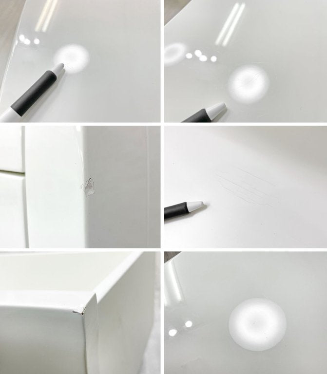 天板に光加減で見える細かな線傷が複数見受けられます。フレームの角や抽斗の角に打痕、抽斗の底板に擦れがある等、軽微なダメージがございますが、いずれも然程目立つものでは無く中古品としては概ね良好なコンディションを保っております。