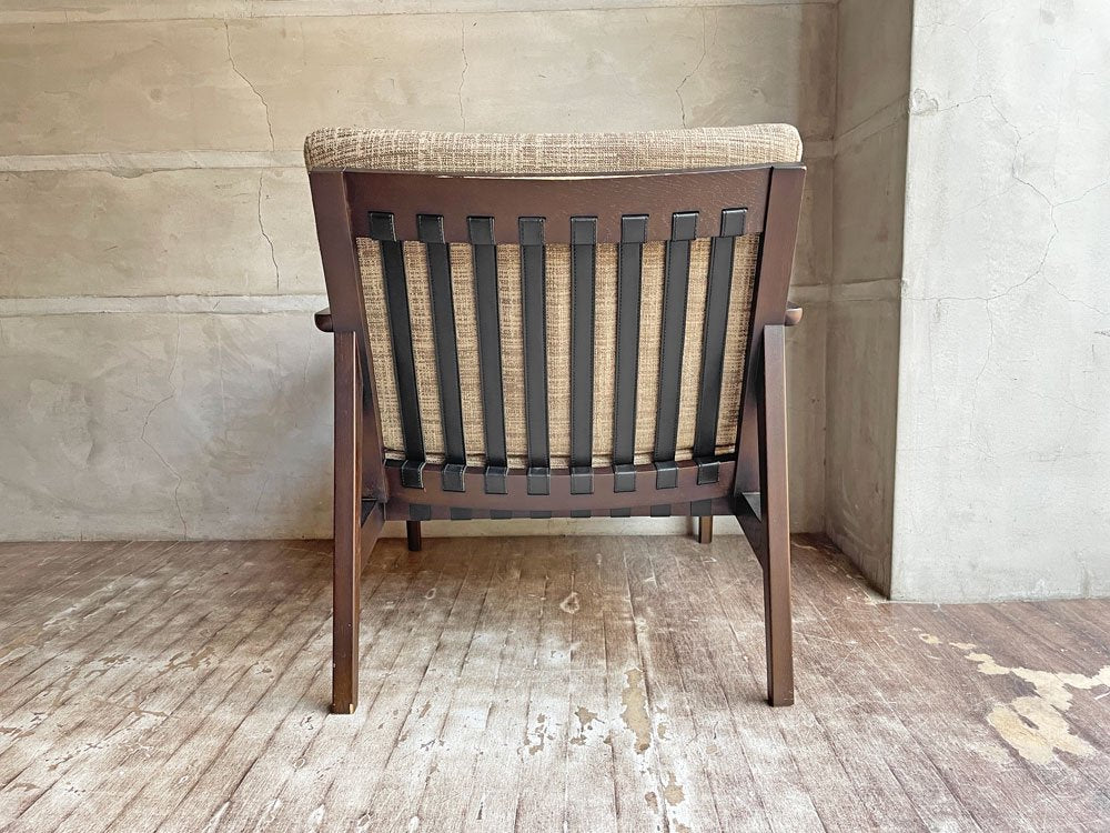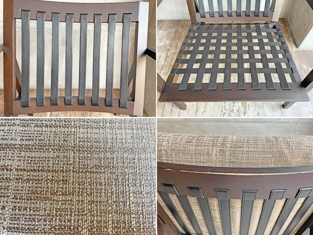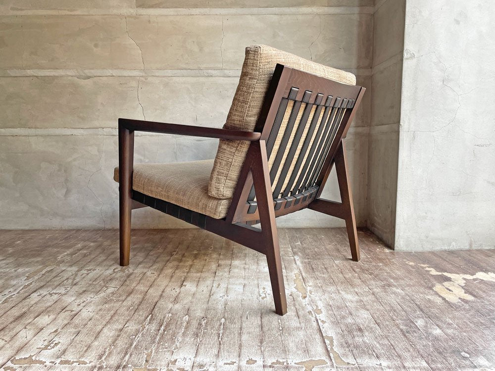 今回は、オーク材にウレタンのブラウン塗装を施したシックな一台。背もたれフレームは本革のベルトで張られ、快適な着座を実現しデザインにもアクセントを加えております。