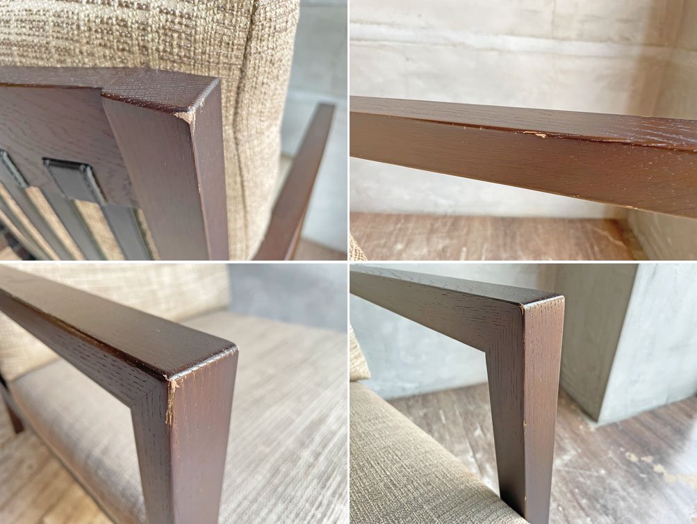使用に伴う複数の傷や打痕、ファブリックに微かな日焼けによる変色や擦れが見受けられます。その他、使用に問題をきたすようなダメージ、クッションにヨレやヘタリ等も無く、USED品として概ね良好なコンディションを保っております。