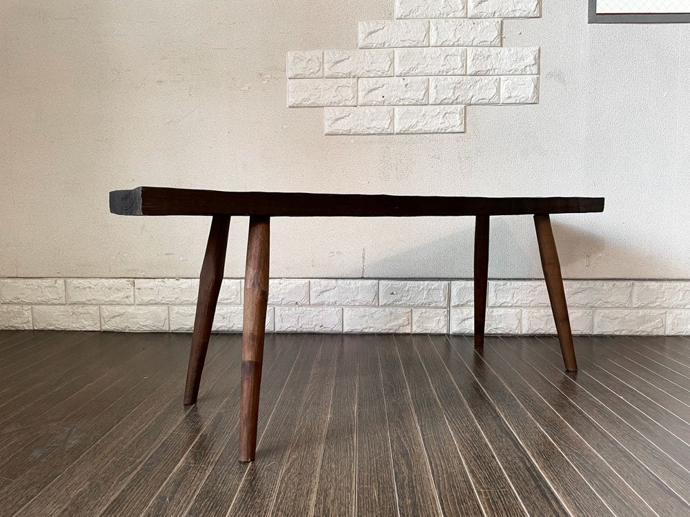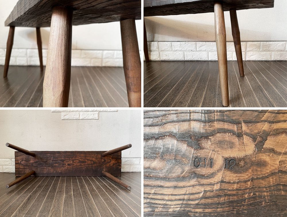こちらは、クラフト家具のような風合いのお品物です。擦れや傷、縁の削れ、木色のムラ、黒ずみ、取り切れない汚れ等が散見されますが、味わいとしてお楽しみ頂けます。なお、座面に若干の木部の亀裂がございますが、ご使用に問題となるぐらつきなどはございません。今後も安心して実用いただけます。