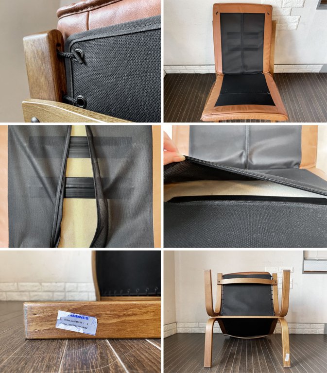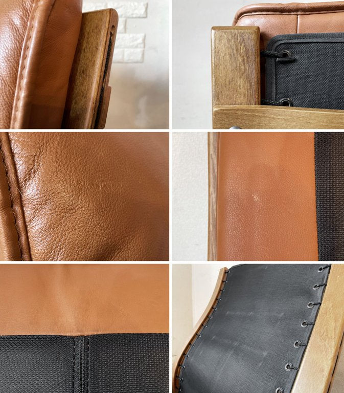 使用に伴いレザーにはシワや黒ずみ、若干のひび割れ、小さな引っかき傷、擦れ等が見受けられます。また、フレームには擦れや傷がございますが、いずれも著しく美観を損ねるダメージではございません。着座使用に問題となる箇所はなく、これからも気持ちよくお使い頂けるコンディションを保っております。