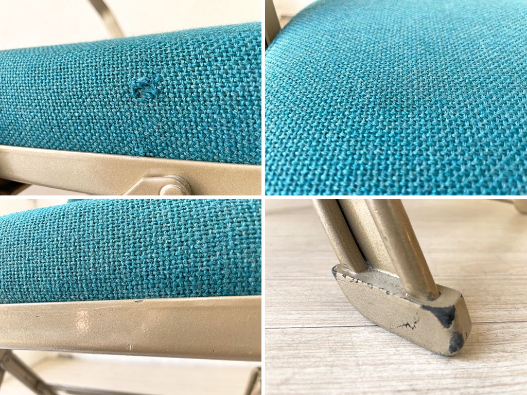 使用に伴い、座面のファブリックには小さな穴や僅かな薄染みが見受けられます。また、金属製のフレーム部分にはスレや傷、ペイントロスがございます。その他、フレームの歪みやガタツキといった使用に問題となるようなダメージは無く、USED品としては概ね良好なコンディションを保っております。