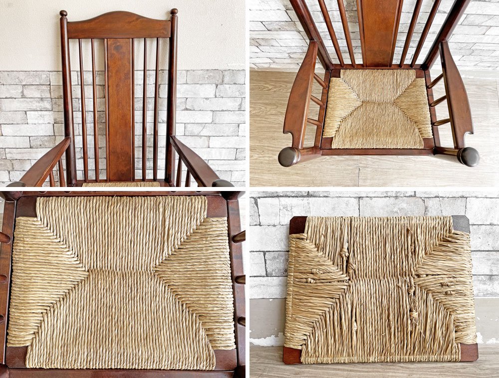 フレームには塗装の剥がれや打痕、擦れや線傷等が全体に見受けられます。また座面は天然素材のためささくれや小さな傷が生じていますが、着座使用に問題はございません。なお、編み目には取り切れないホコリ等がございます。予めご承知おきくださいませ。
