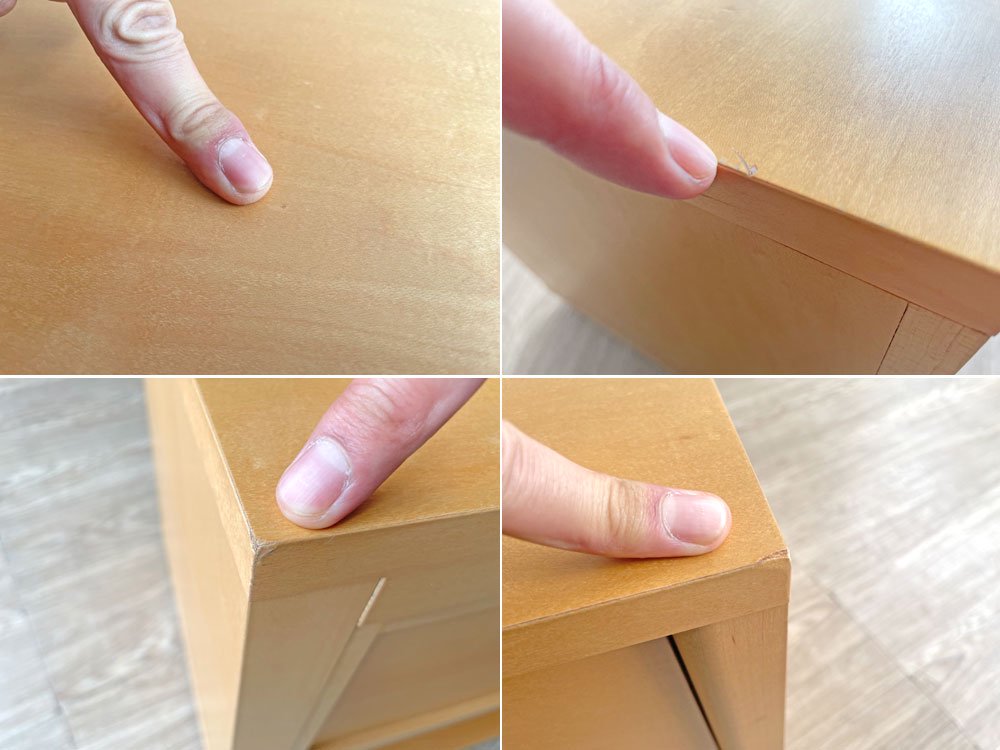 使用に伴い天板に僅かな日焼けによる色ムラ、擦り傷や打痕、突板の欠けなどが見受けられます。引き出しの開閉などご使用に問題となる大きなダメージはございませんので、中古品としては概ね良好なコンディションを保っております。