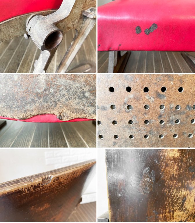 こちらは、ビンテージのお品物です。経年や使用に伴い、フレームには擦れや傷、錆、落としきれない汚れ、シートには煙草の焼跡や破れ、汚れ、黒ずみがございます。座面は内部のクッションが劣化しているためかPVCレザーが若干ぷかぷかとしています。着座には問題はございません。その他、使用に問題となる大きなダメージはなく、ビンテージ品ならではの風合いを楽しみながら、これからもお使いいただけるコンディションを保っております。