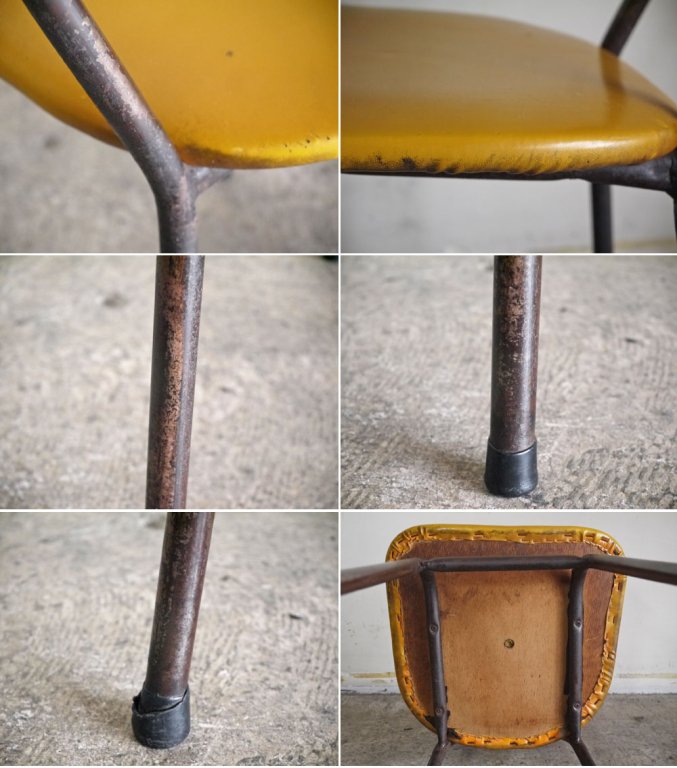経年に伴い、シートに傷や擦れ、小さな破れ、落としきれない汚れ、背もたれ側の鋲の欠品、フレーム全体に錆とペイントロス、座面裏に染みなどが見られますが風合いとしてお楽しみください。