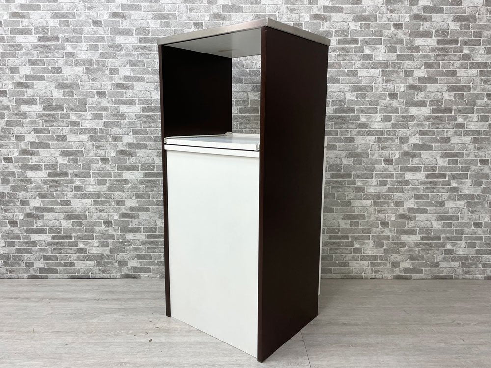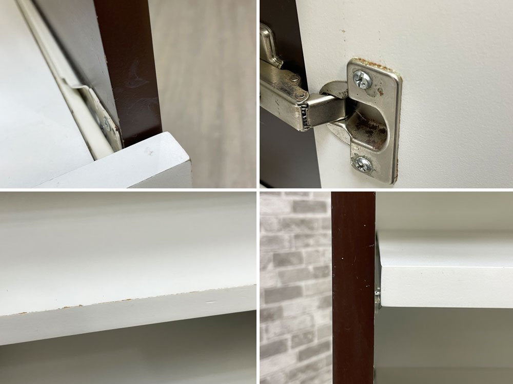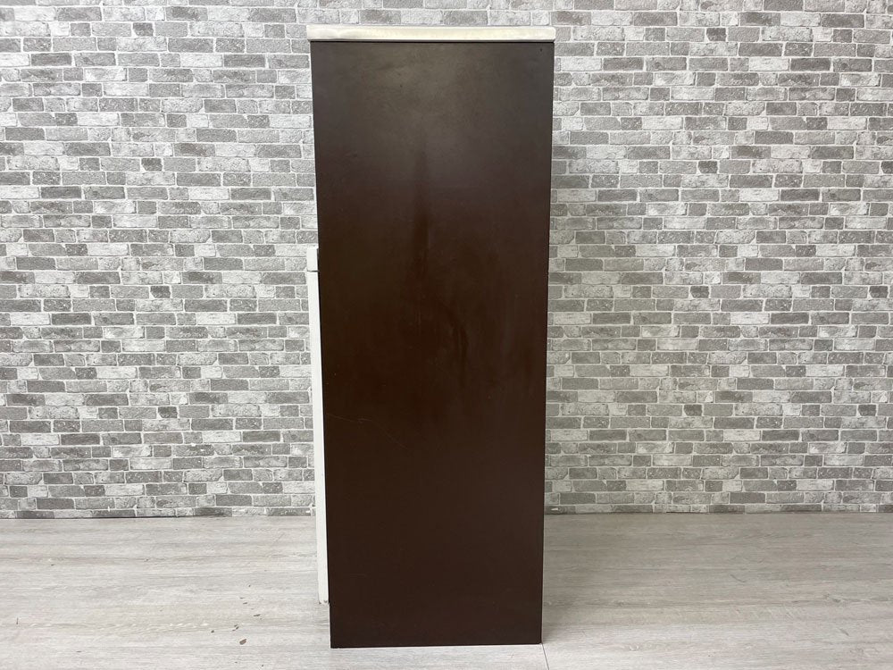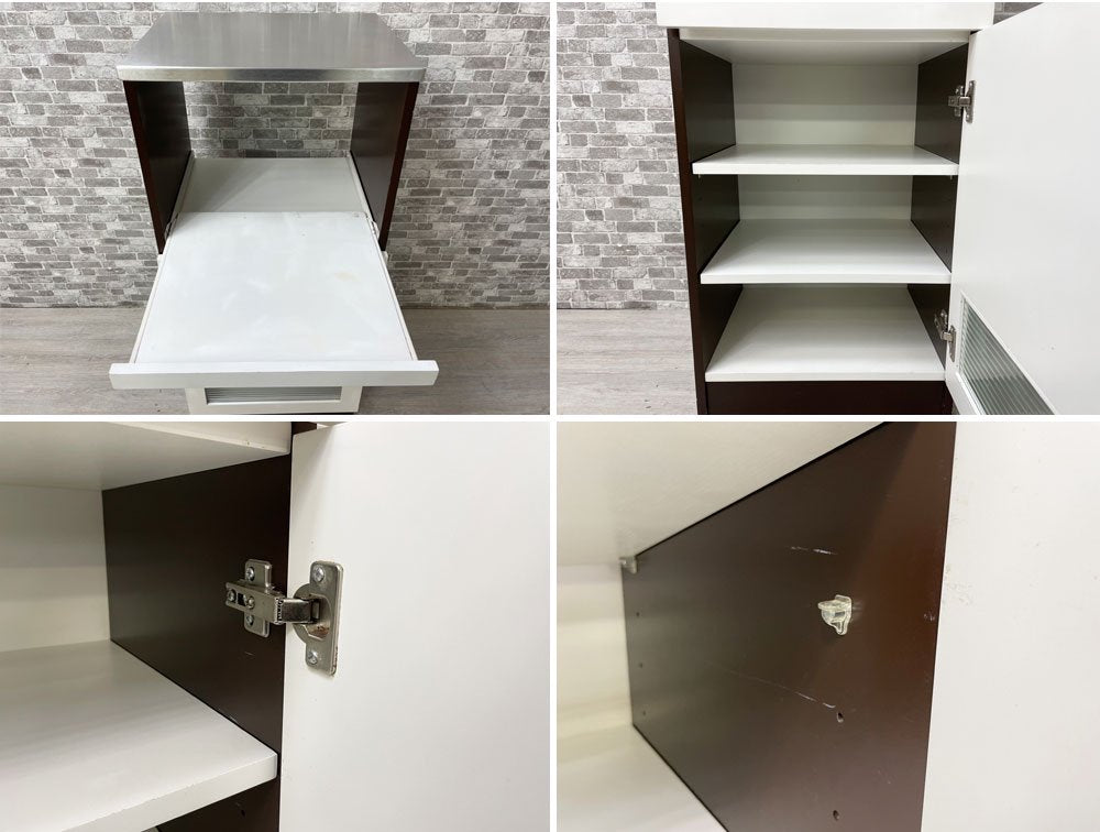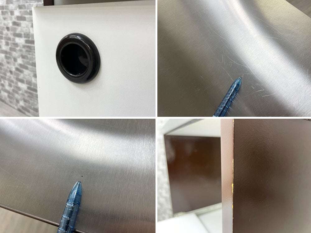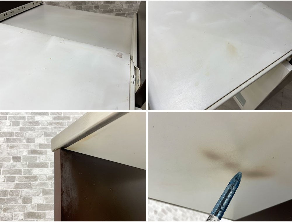 使用に伴い、金属製の天板には線傷が散見され、木製の部分の縁には打痕や剥げが確認出来ます。また、天板裏、可動棚表面には薄汚れが見受けられ、スライド丁番には錆がございます。棚内部の一段目の左側に隙間がございますが大きいものではなくご使用頂く上では然程影響は無いかと思われます。