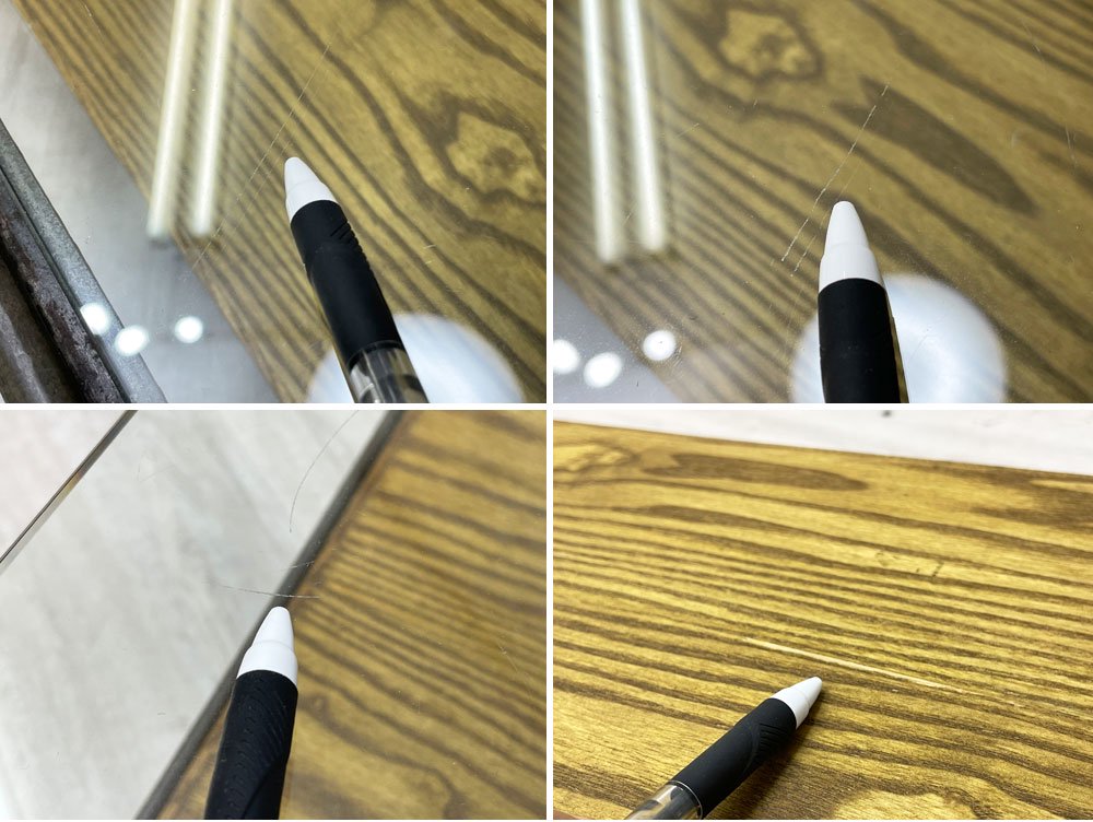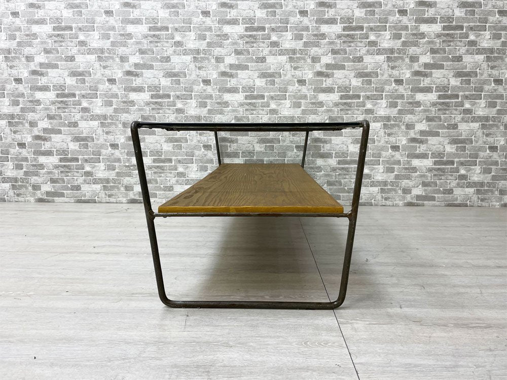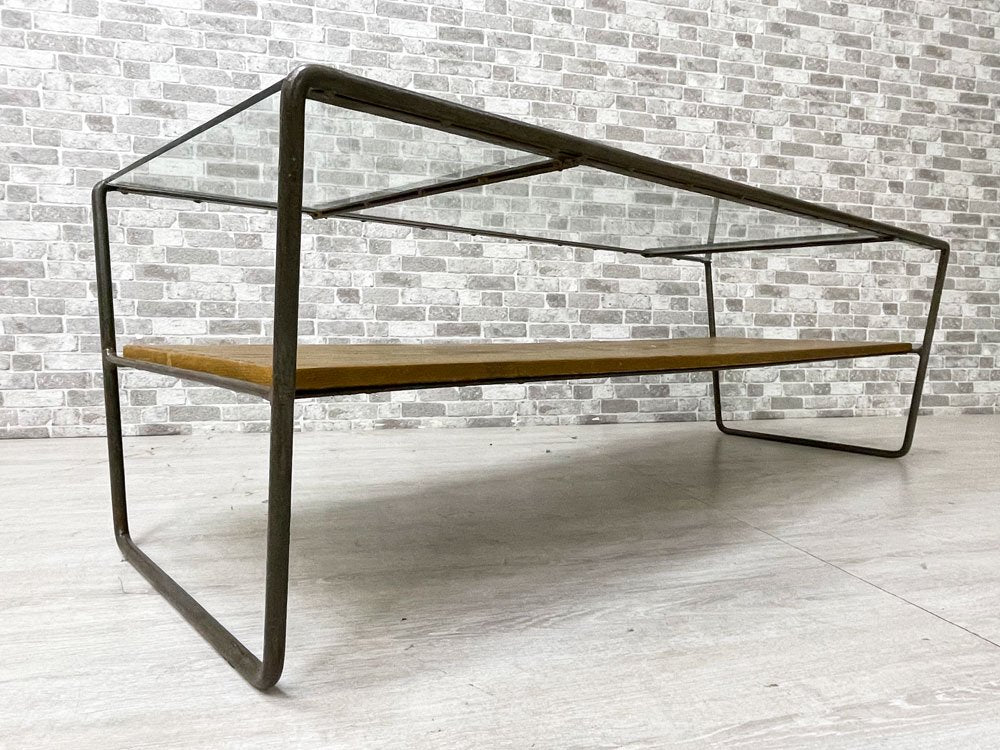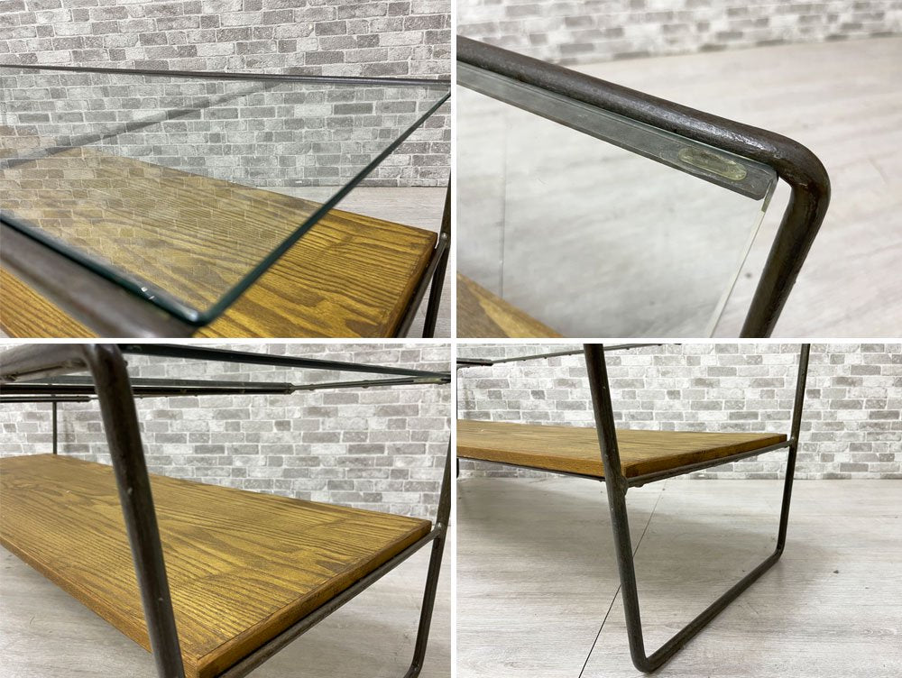 使用に伴いガラス天板には線傷が散見され、木製の天板表面や側面には剥げが見受けられます。こちらはビンテージ加工を施したお品物となっており、金属のフレームに錆びやくすみは製造時のものかと思われます。