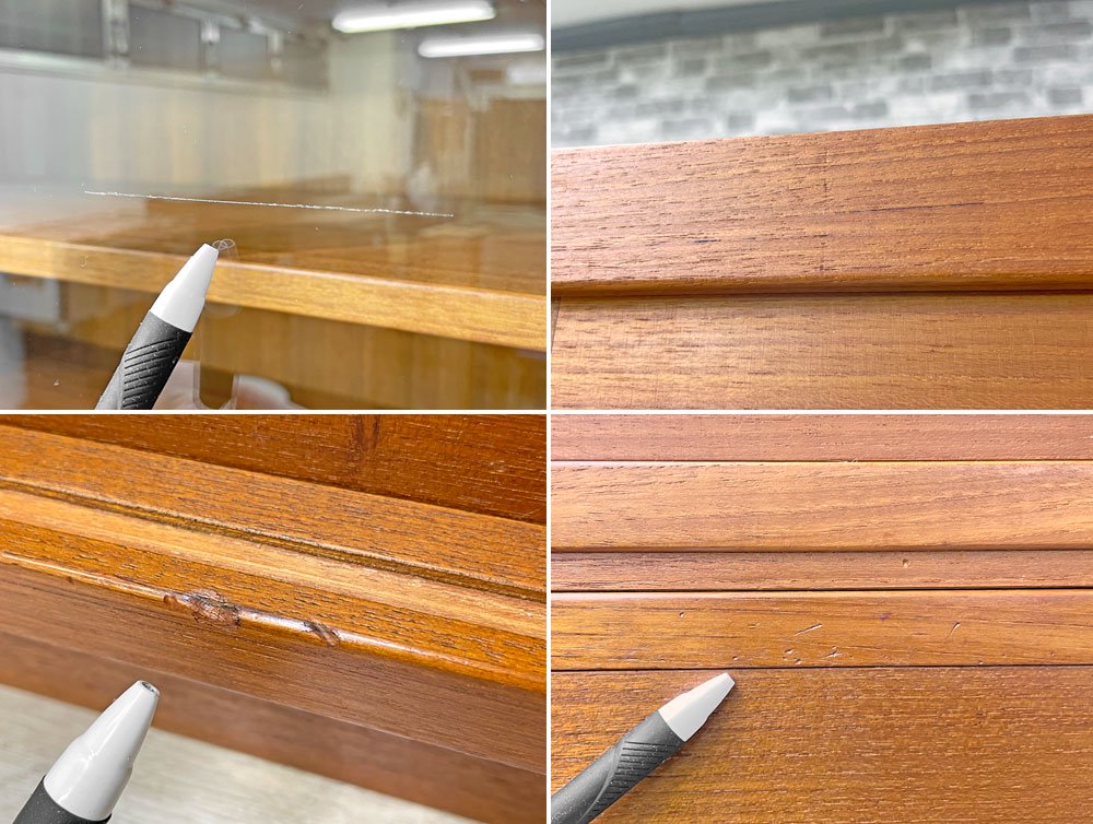 こちらはビンテージ品となります。細かな擦れ傷の他、打痕、ペン痕、側面の水跡、棚板のヤケ、ガラスに線傷とやや使用感が見られますものの風合いを損なうものでは無く、年代を考慮すると良好なコンディションを保っております。ご使用に問題となるダメージは無く、今後とも気持ち良くお使い頂けます。