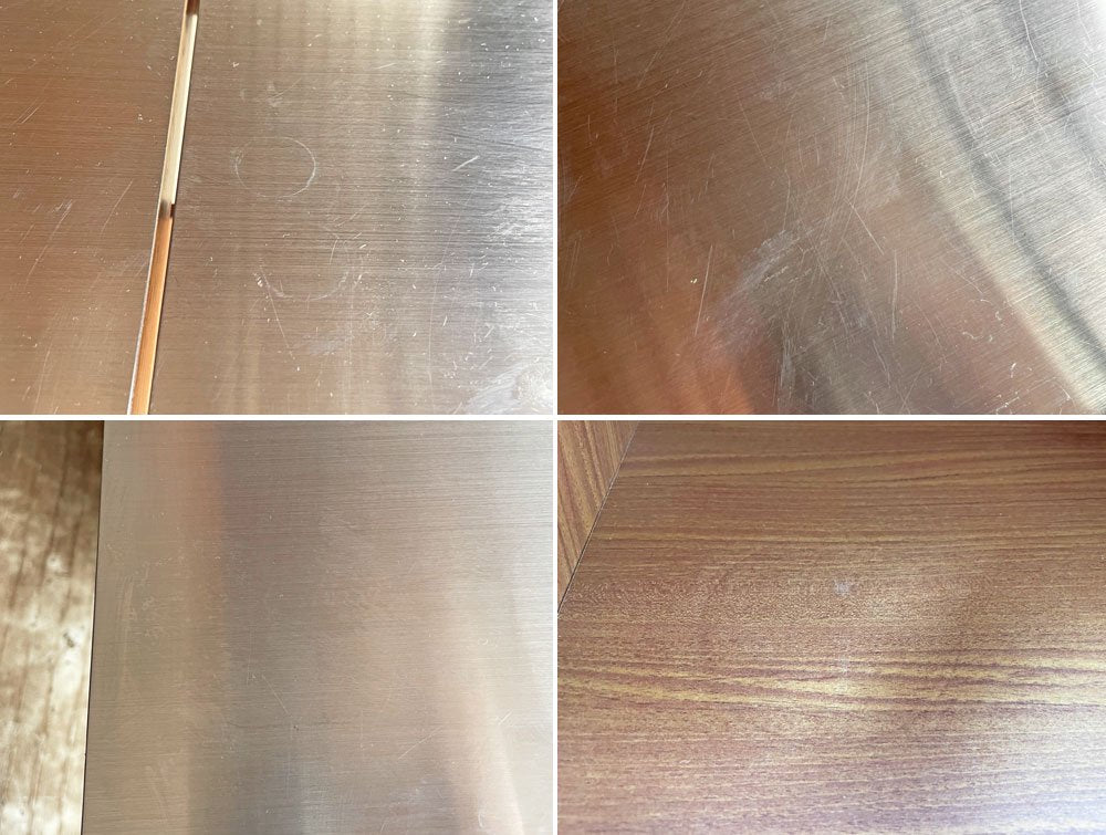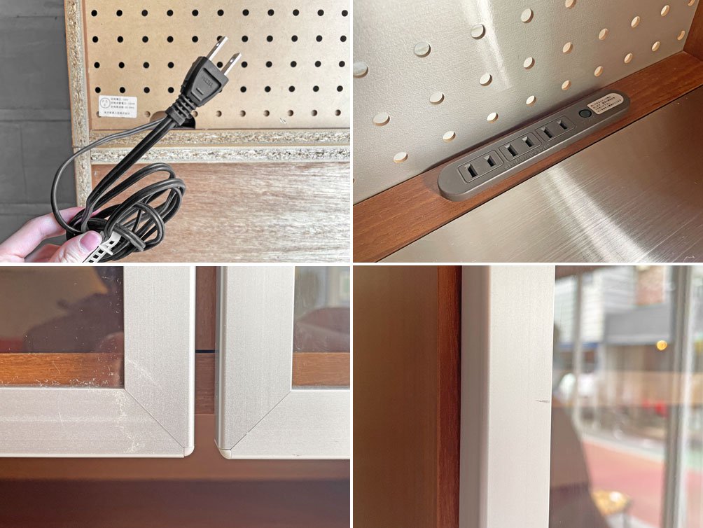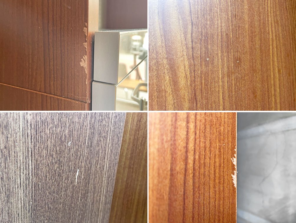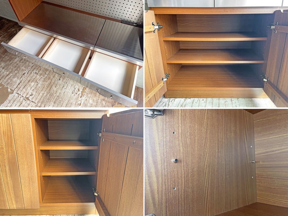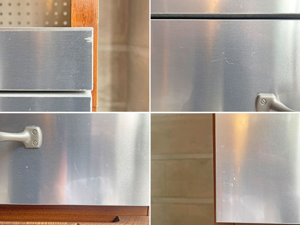 プリント合板表面の傷や剥がれ、一部棚板の輪染み、ステンレス製天板や抽斗の線傷や打痕が見受けられます。その他、大きく目立つダメージはなく、USED品として概ね良好なコンディションを保っております。
