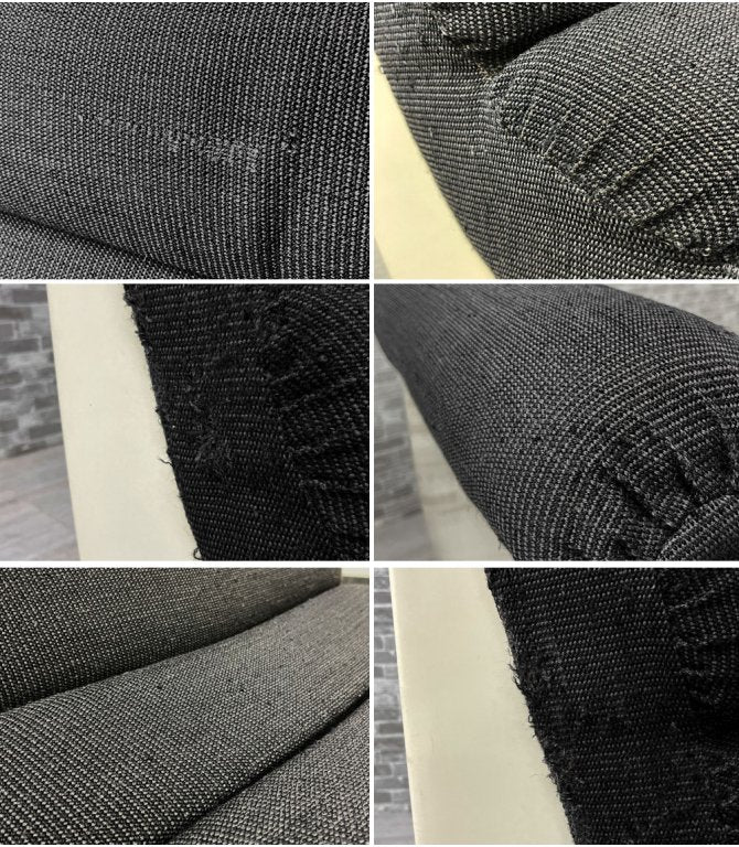 こちらはビンテージ品となります。経年に伴う擦れや傷、ファブリックの毛玉や破け、ホツレ、補修痕などが多数見受けられます。またFRPベースにも複数箇所の傷、スクラッチ傷、カケなどが見られ、全体的に時代を感じさせるコンディションとなっております。脚部のキャップが一部既製品ではなく、別のパーツに取り換えられておりますが、ガタツキや強度などの実使用には影響御座いません。クッションにヘタリはございますが着座の際にそこまで違和感を感じる程では無く、ビンテージ品としてまだまだ実用に耐えうるコンディションかと思われます。