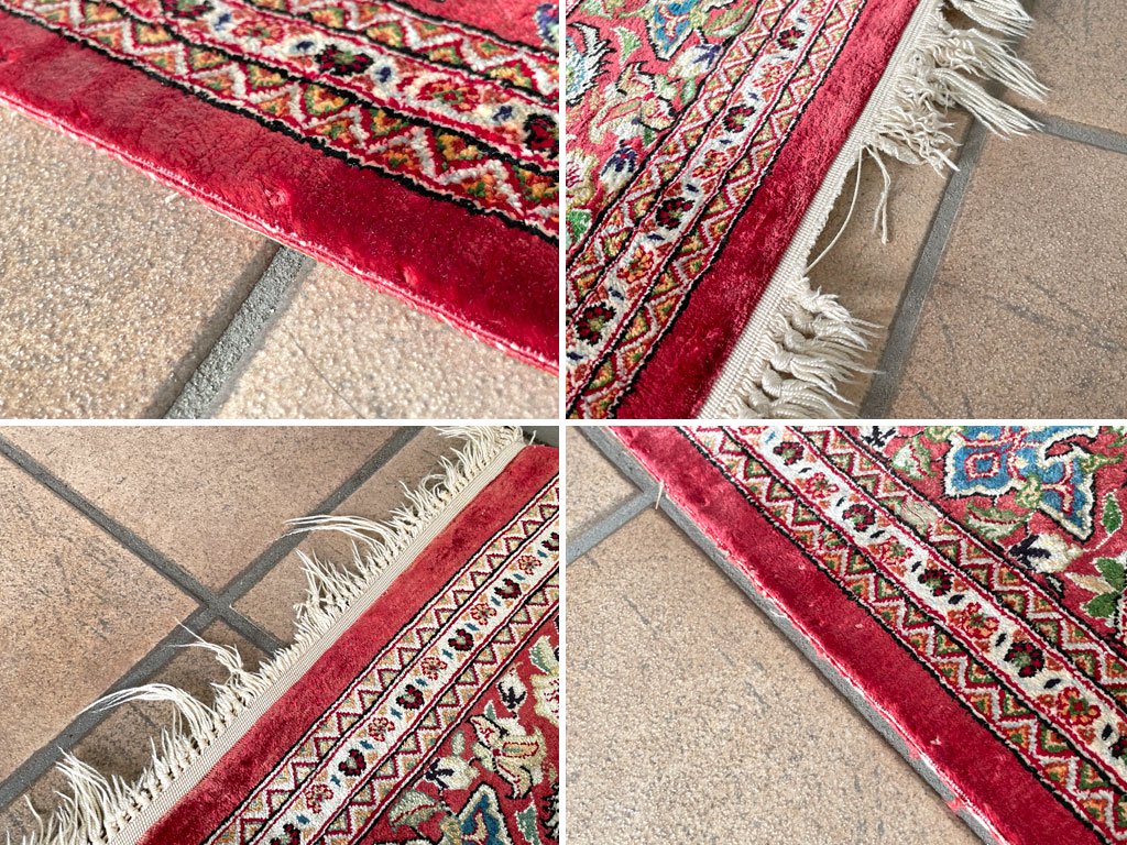 使用に伴い毛の倒れや若干の色ムラ、細かなほつれ、フリンジの欠損が数か所確認できますが、目立つ程のものではございません。一部角にかけて色が黒ずんでいるようにも感じられますが、柄の細かいラグですのでこちらも気になる程のものではないかと思われます。その他大きく美観を損なうようなダメージやにおい等も感じられず、これからも気持ちよくお使い頂けるコンディションです。