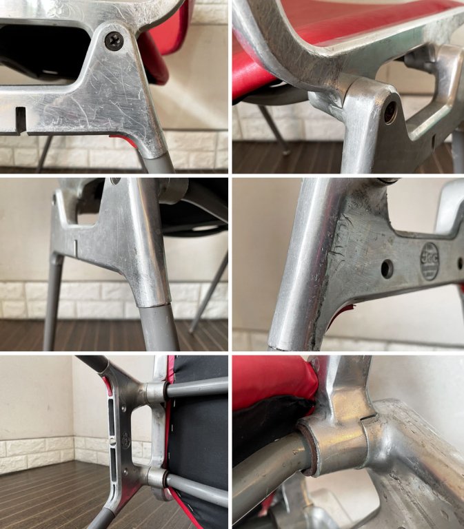 こちらはビンテージのお品物です。フレームには、擦れやガリ傷、変色、取りきれない汚れ、プラスチックの割れ等が確認できるとともに、背座面には傷や小さな穴、スレ等が見受けられます。