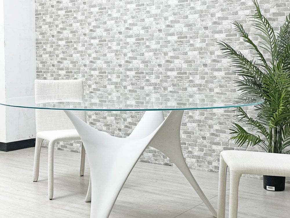 重厚感がありながらも、透明なガラス天板とテントのように軽快な脚部のシルエットが全く重苦しさを感じさせません。