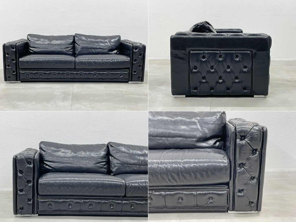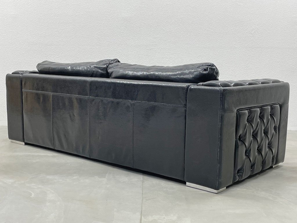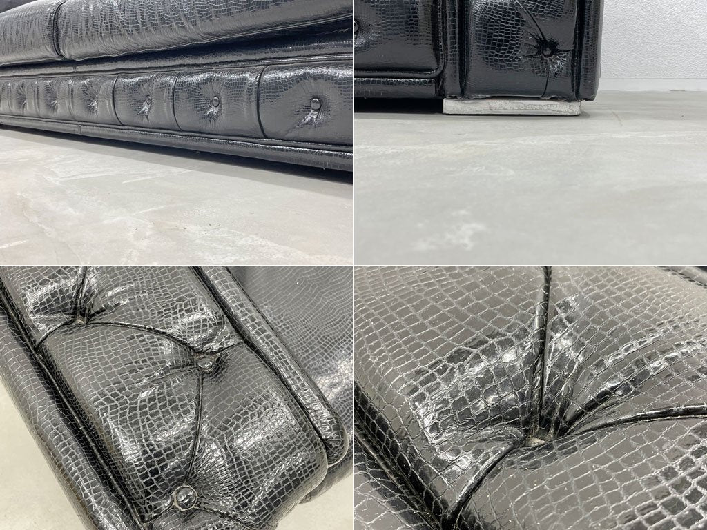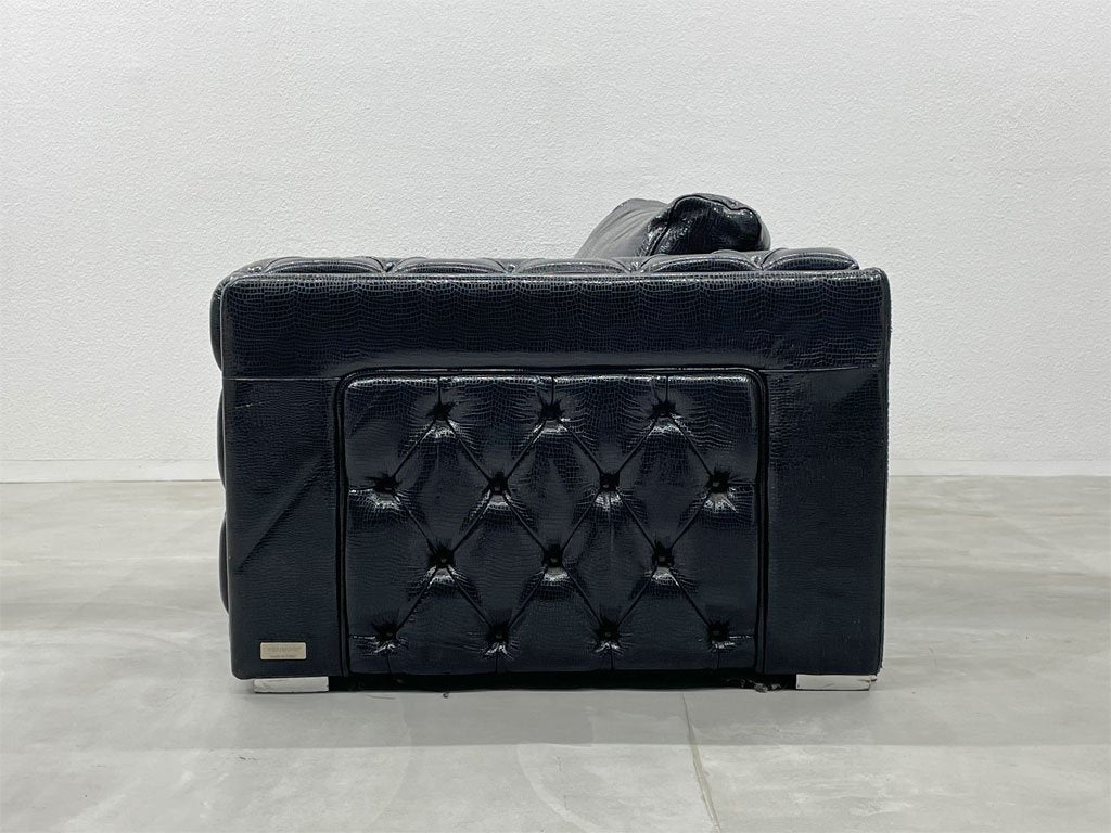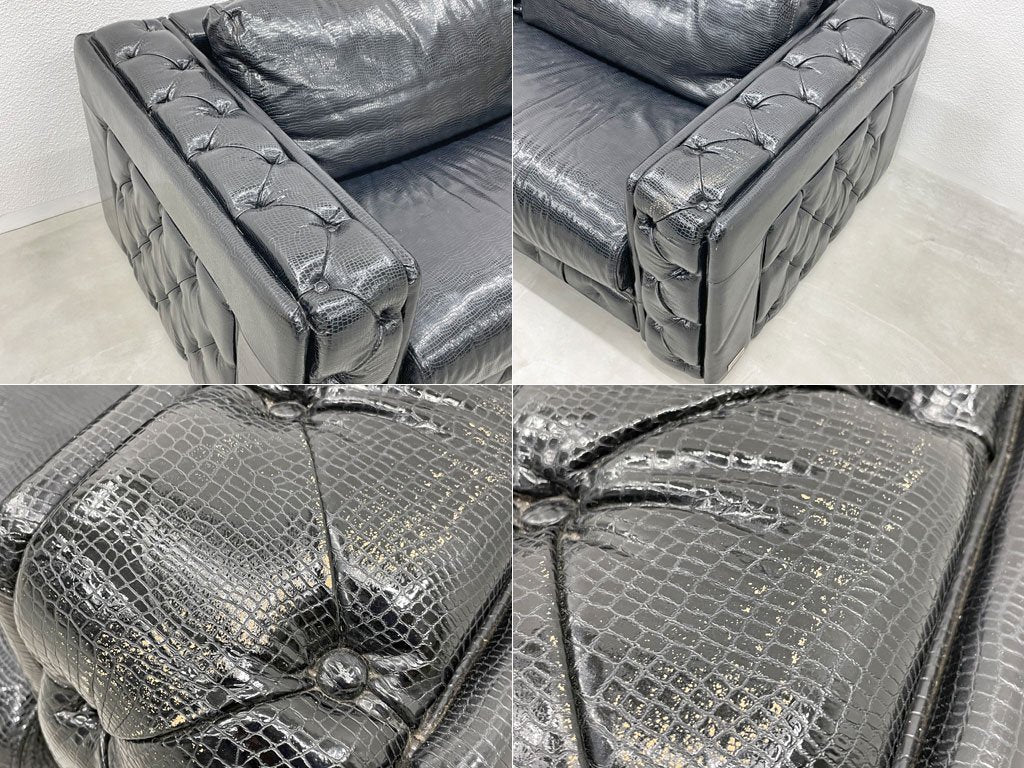 こちらは、リザード柄の本革ソファとなり、アームにはボタン留によるアクセントを加えた遊び心のあるユニークなデザイン。