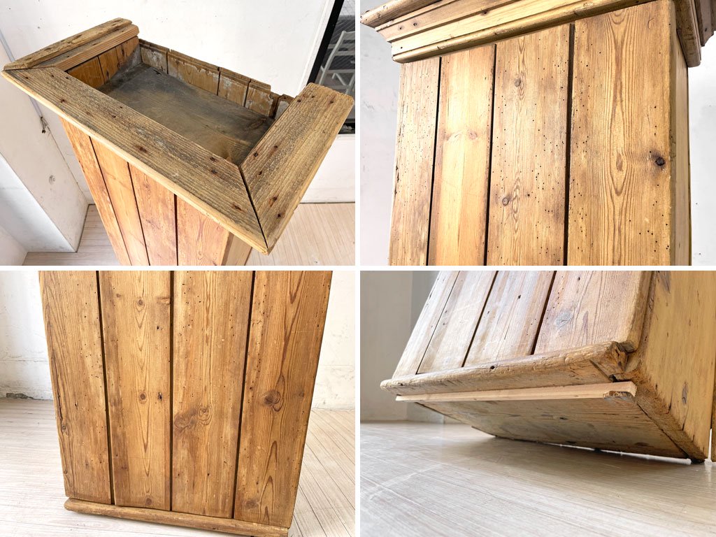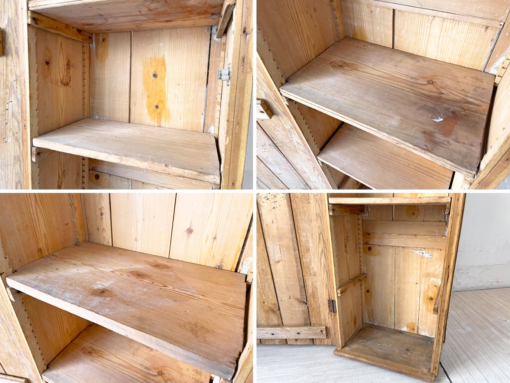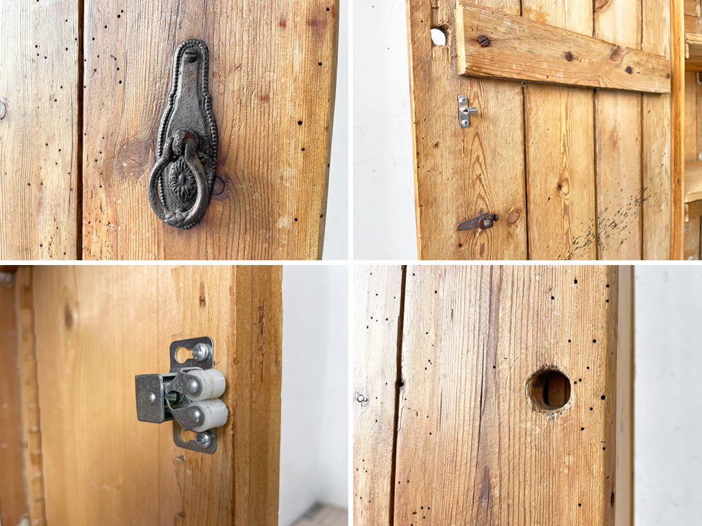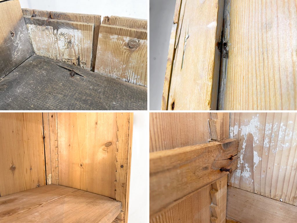 コチラのお品物はアンティーク品となります。使用・経年に伴う傷やスレ、汚れやペイント痕、ヒビや割れ、釘の先や頭が出ている箇所などがございます。また、古いお品物となりフレームの歪みや反り、多少の傾斜が見受けられます。歪みなどにより扉が完全には閉まり切らなくなっておりますが、後年に取り付けられている扉のローラーキャッチにより、扉が勝手に開いてくるということもございません。その他、土台下に本体のバランスを保つための木枠が取り付けられています。また、扉の金属取っ手は取っ手としてのご使用は可能ですが、扉裏面の鍵は機能いたしません。その他、扉にシリンダーが取り付けられていたような穴がございます。