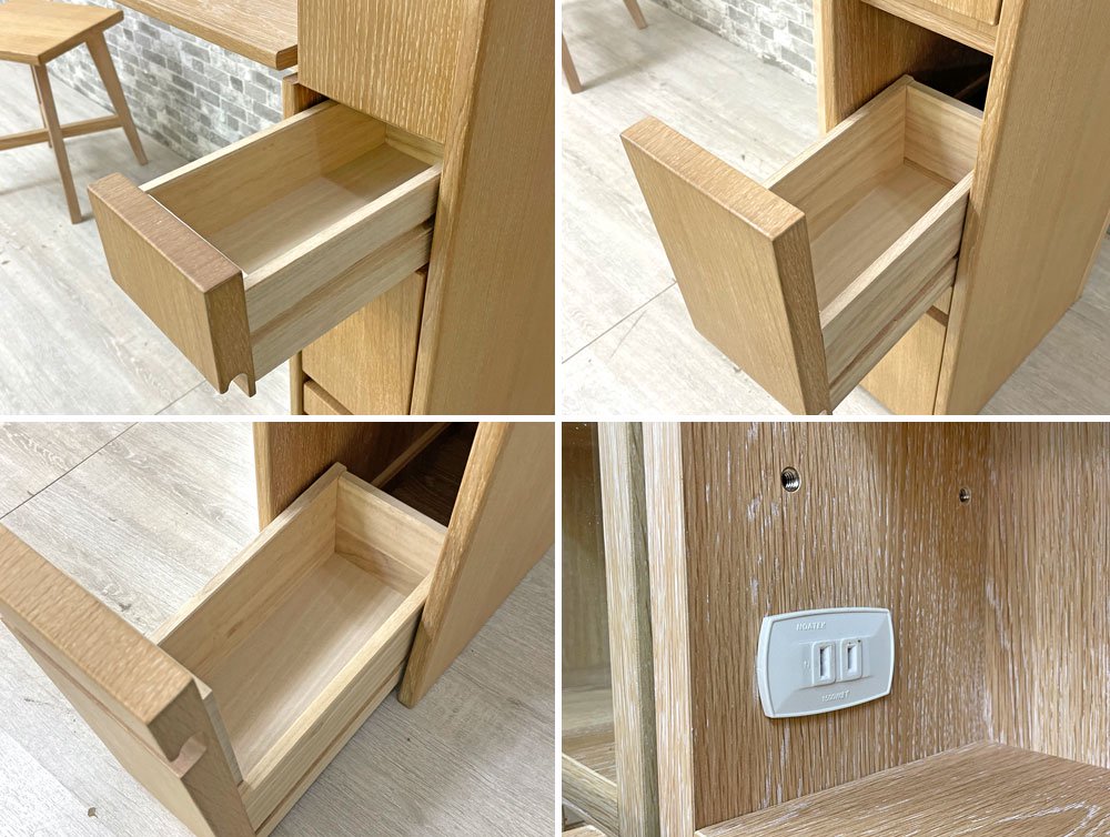 抽斗は容器の大きさに合わせて分類収納出来る為、日常使いし易い設計。天板を下げた時、その収納内部にはコンセント穴があり、ドライヤーの電源を直接とる事が出来ます。