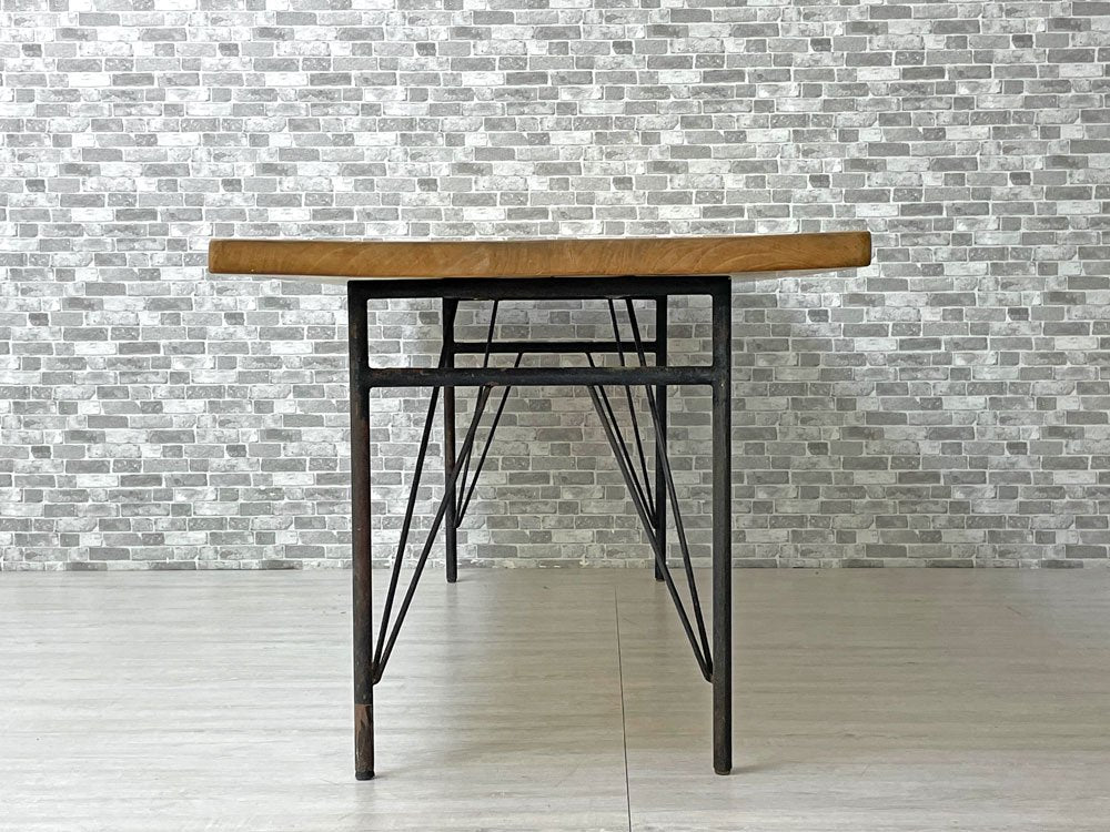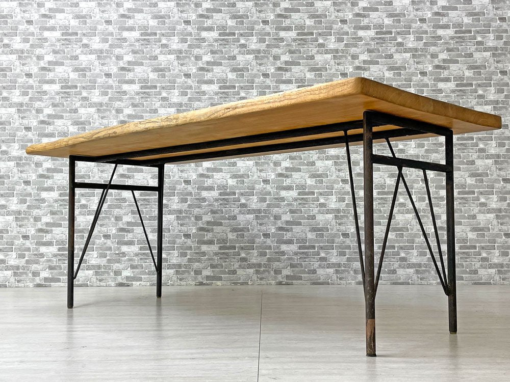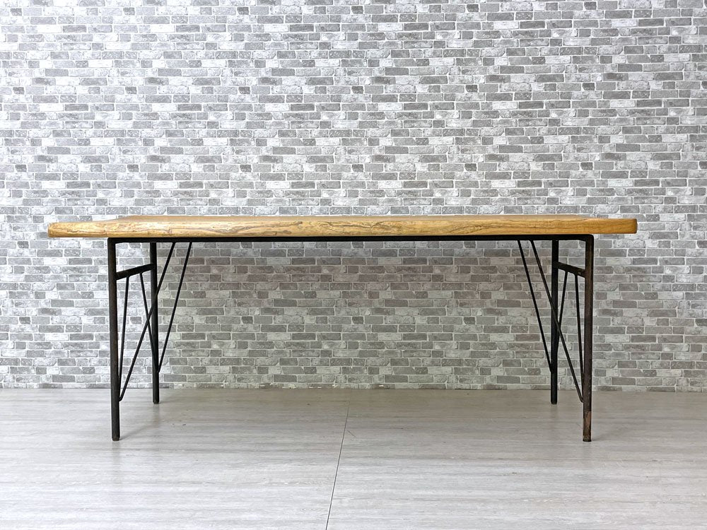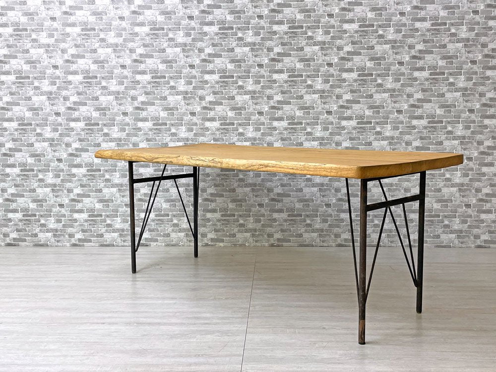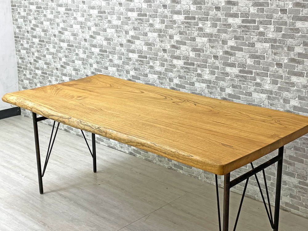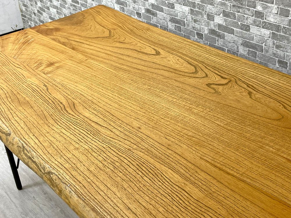 インダストリアルデザイン タモ無垢材 ダイニングテーブル W180 耳付き アイアンレッグ リメイク家具 ハンドクラフト ●