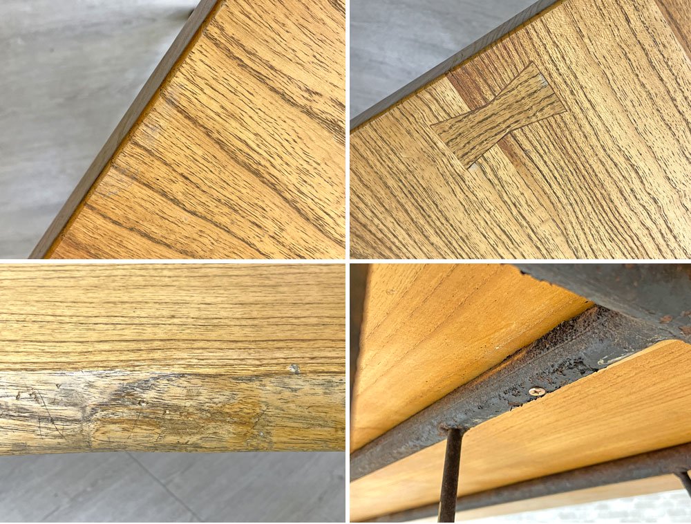 使用に伴う擦れや傷、色褪せ、くすみ、天板の反りなどがございます。また、脚部が全体的に錆ついており、触ると塗装表面が剥がれ落ちます。その他美観を大きく損ねるような大きな汚れや機能を損なうような大きなダメージなどはございません。