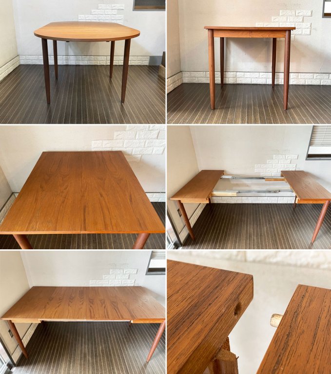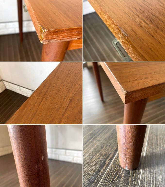 北欧デンマークで作られたと思われるダイニングテーブル。シンプルな造形が故に引き立つチーク材の風合いに、長い時の流れを感じさせます。