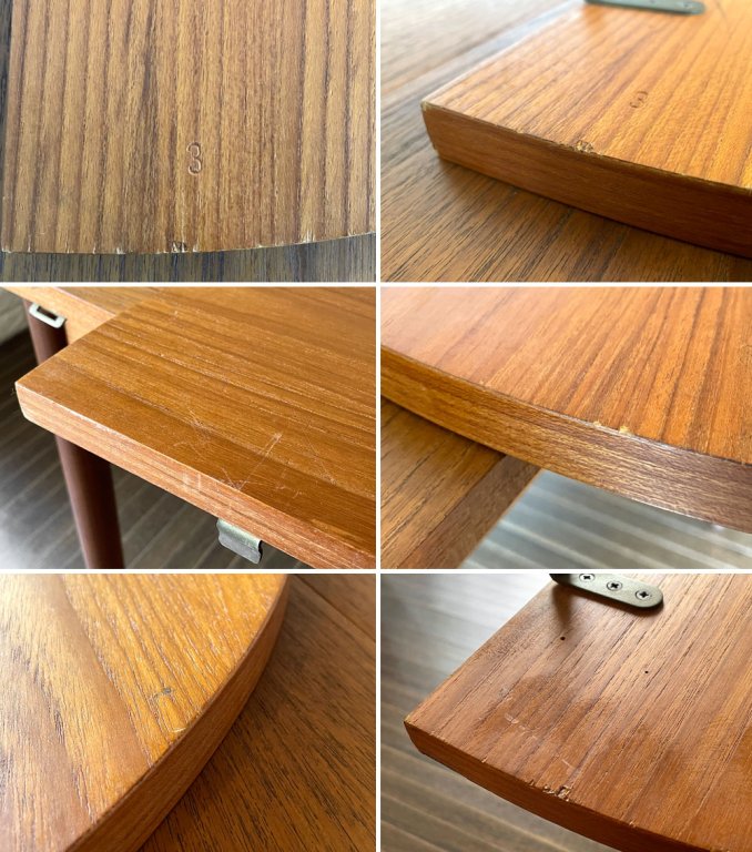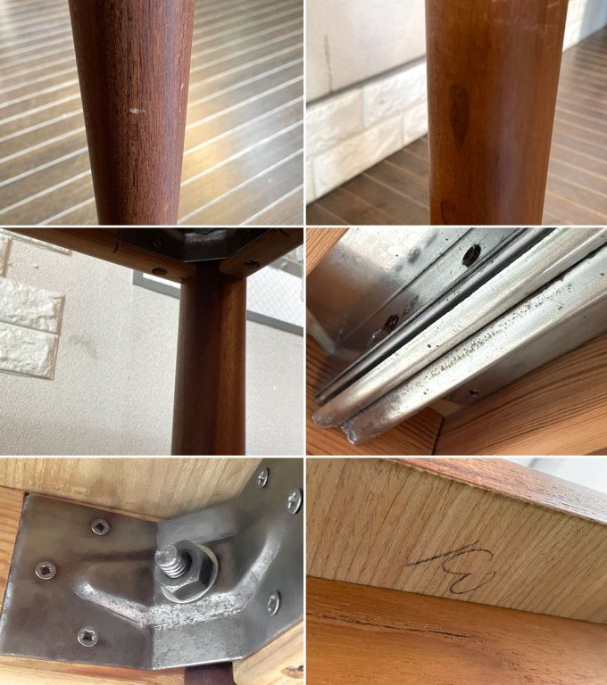 こちらはビンテージアイテムです。全体に傷や擦れ、打痕、木肌の剥がれ、落としきれない汚れ等が見受けられます。また、天板裏にペン痕、脚部に擦れや白い汚れ、金属部分に錆が確認できます。