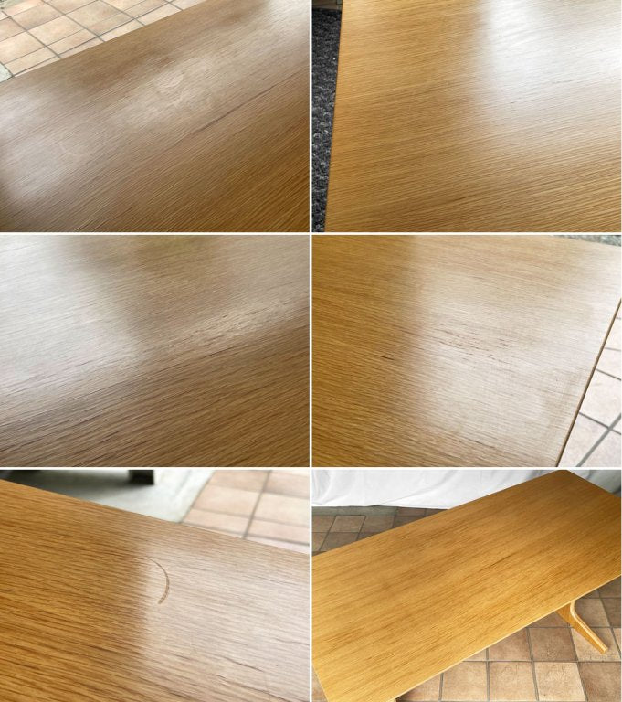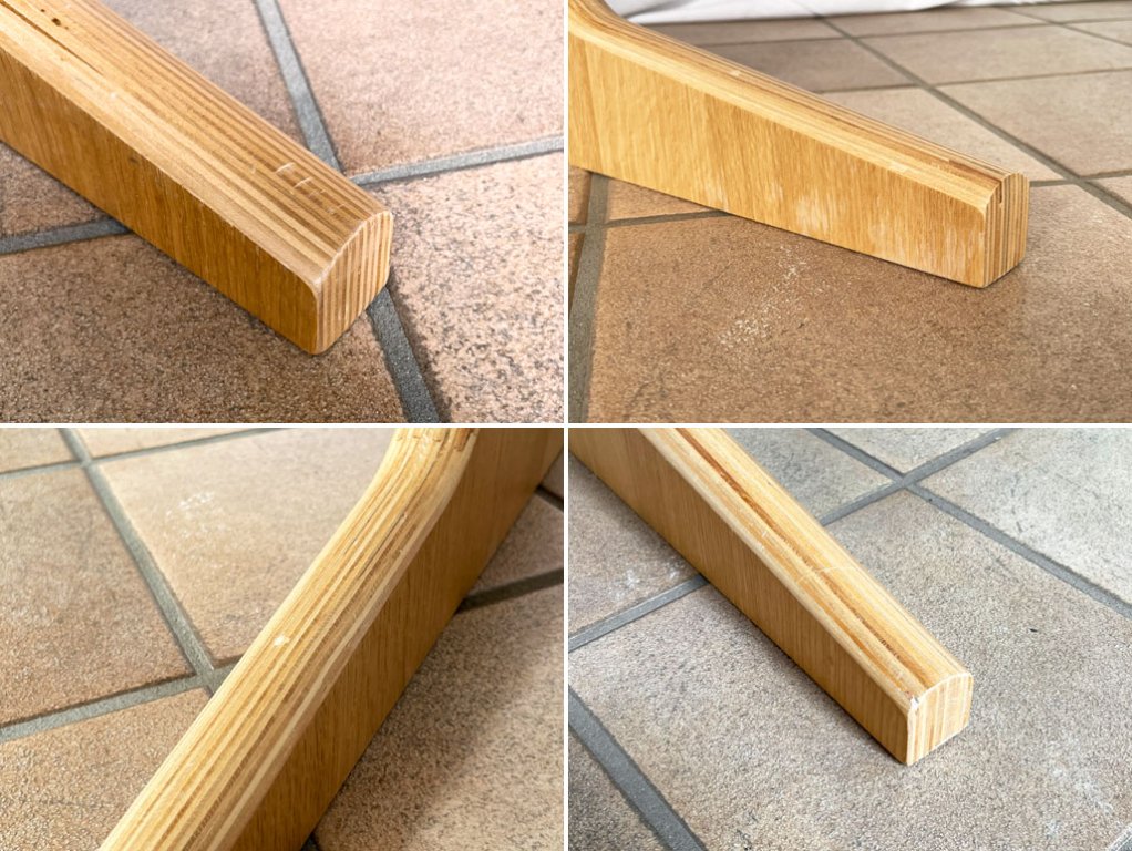 使用に伴い天板には薄い線傷や輪染み、また水分を吸った為と思われる若干の表面の凹凸と黒ずみがあり、やや使用感が感じられます。脚にも打痕や擦れが散見されますが、こちらは目立つものではございません。ガタツキや割れといった使用上問題となるダメージは見受けられず、これからも安心してお使い頂けるコンディションです。