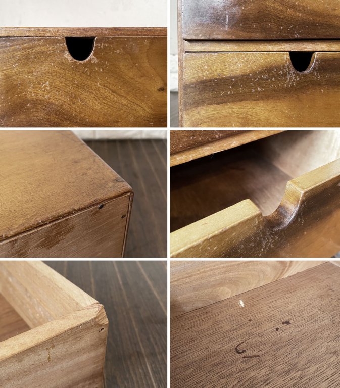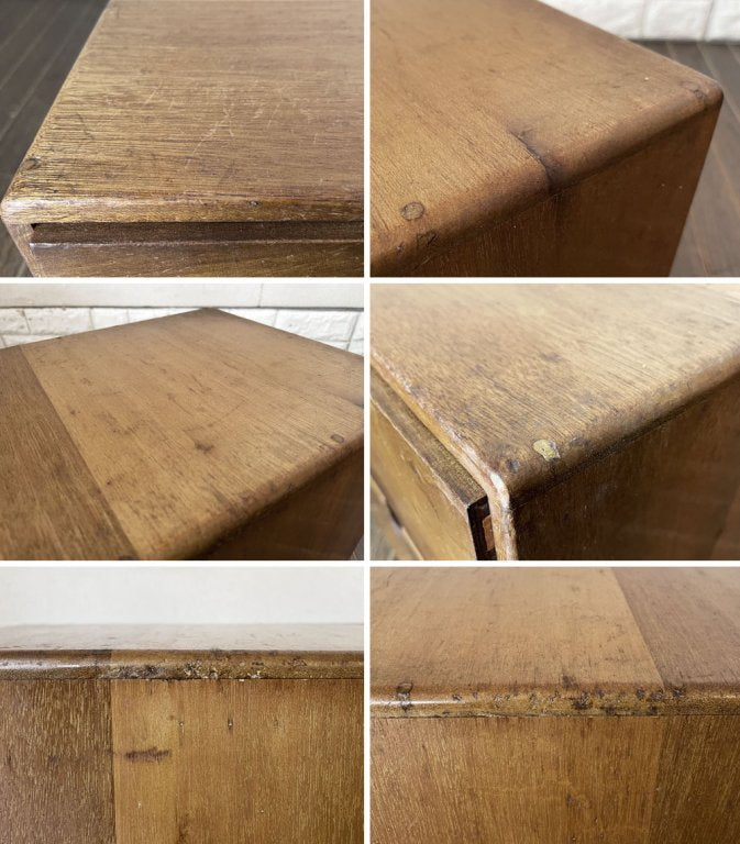 こちらは、ビンテージのお品物です。全体に擦れや傷、縁の削れ、表面塗装の剥げや色ムラ、黒ずみ等が散見されます。また、抽斗内部の取り切れない汚れやゴム痕のほか、抽斗下段の桟が片方欠品しております。その他、抽斗には木部の反りによる隙間や角の欠けなどが生じております。現状開閉は問題なく行えますが、引き出す際にやや固く感じられる場合がございますので予めご承知おきくださいませ。