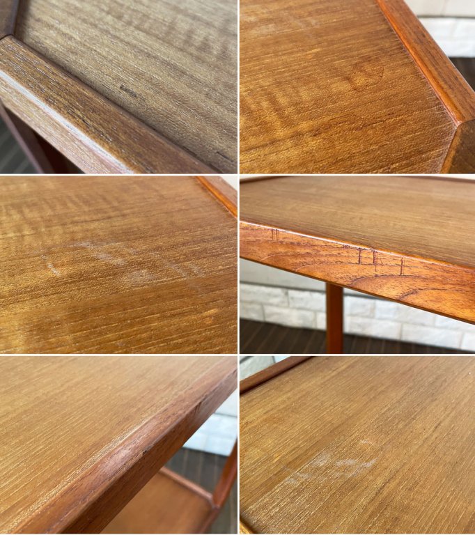 全体に傷や打痕、木肌の剥がれ、擦れ、色褪せ、シミや輪染み、白い汚れ等が見受けられます。