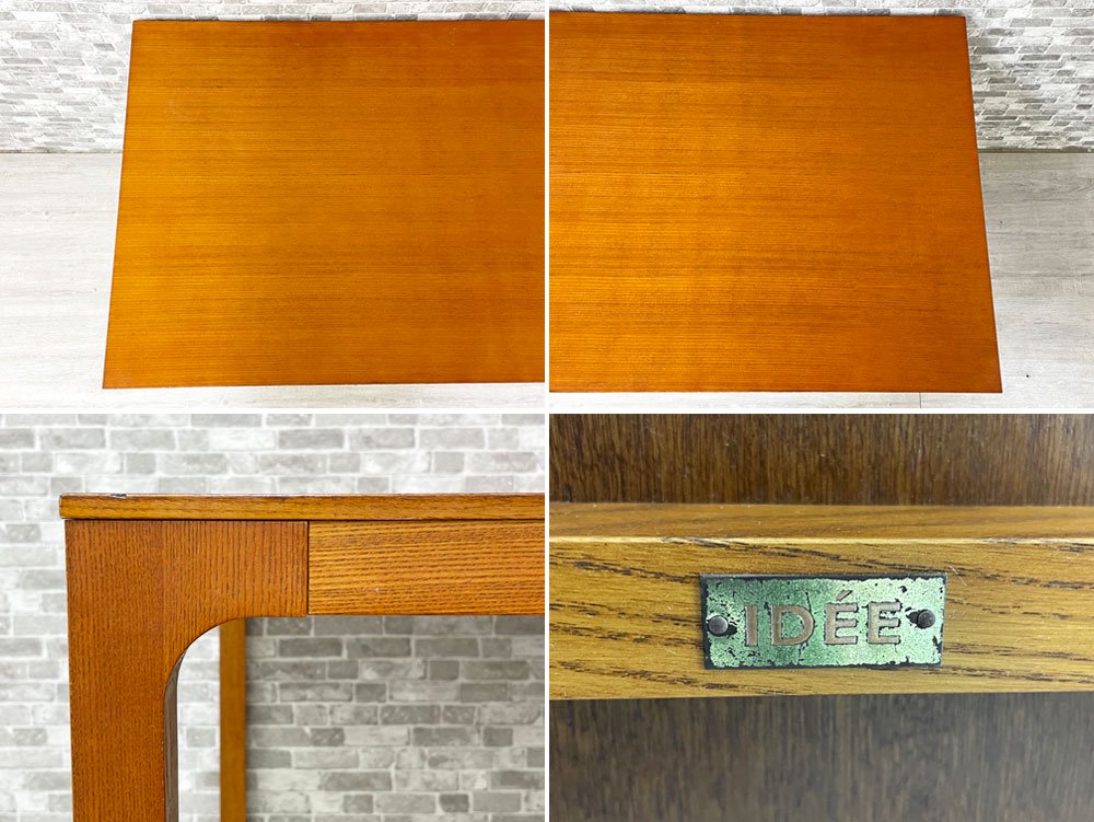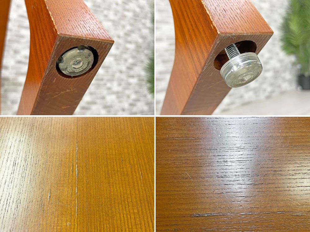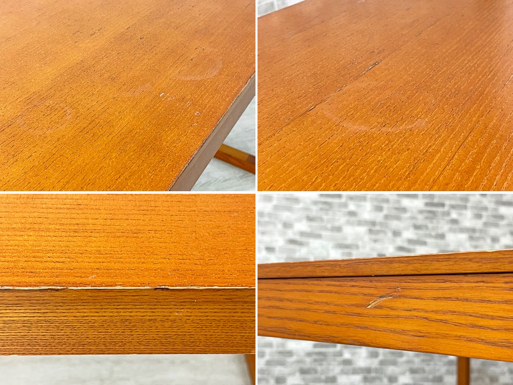使用に伴い天板に突板のヒビ割れや僅かな浮き、ざらつき、輪染み、縁にレタッチ跡などが見受けられます。また脚部に傷や打痕などが散見され、やや使用感はあるものの、ご使用に問題となる大きなダメージはございません。中古品としては概ね良好なコンディションを保っております。