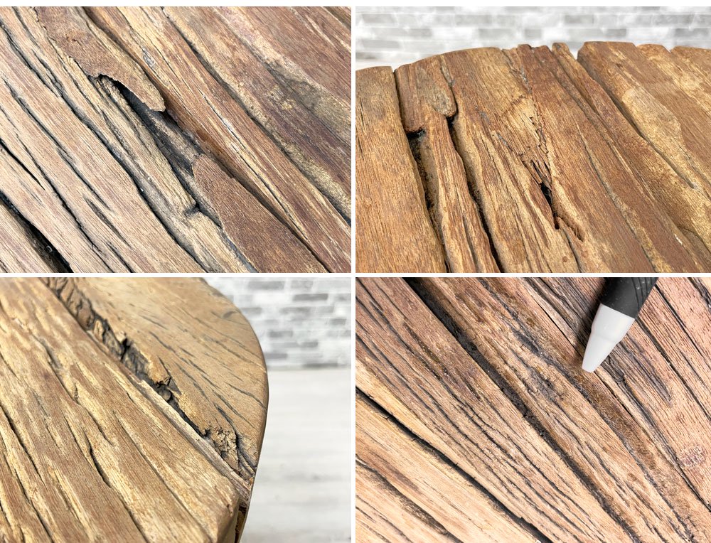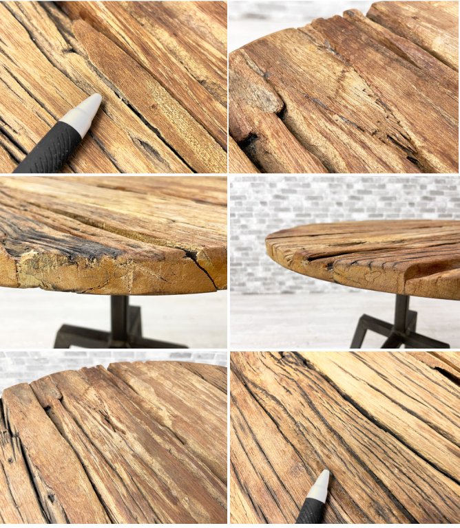 こちらは古材を用いたアイテムとなり、節目や溝、接着痕等は製造時からの物となります。こちらはビンテージライクな風合いとしてお愉しみ頂ければと存じます。細かな染みや取り切れない汚れ、天板にはわずかに反りがみられるものの、ご使用に問題となるようなダメージは見受けられません。今後ともご使用頂ける、USED品として概ね良好なコンディションを保っております。