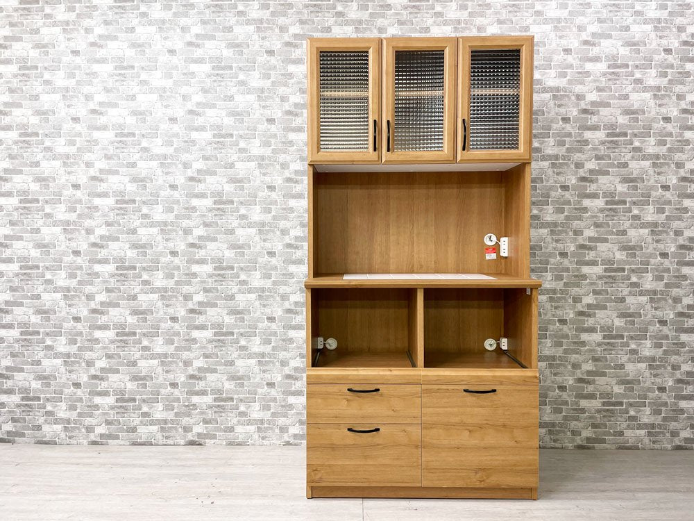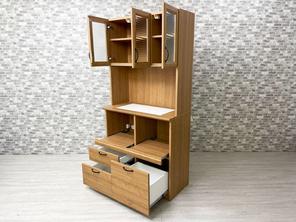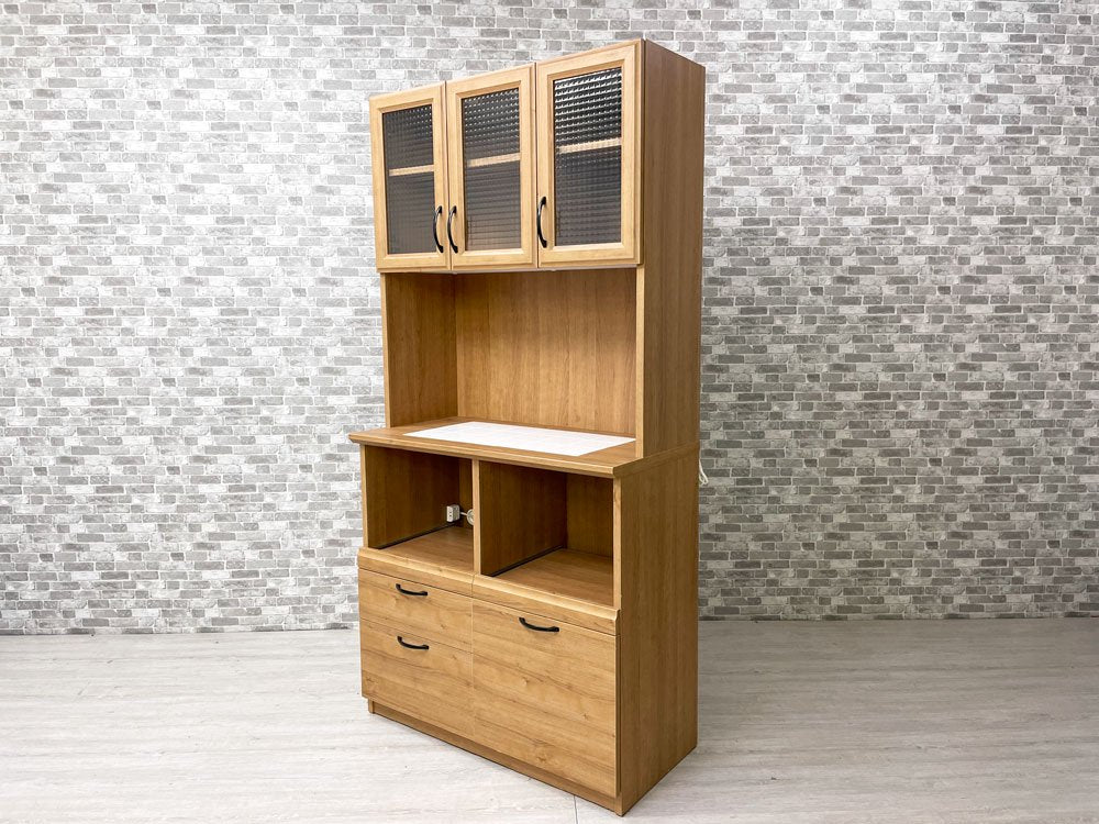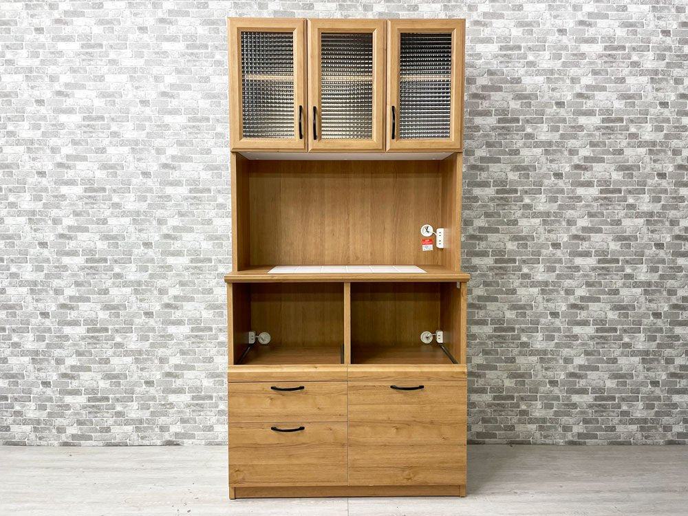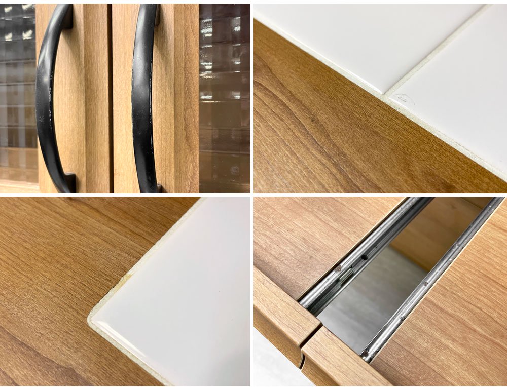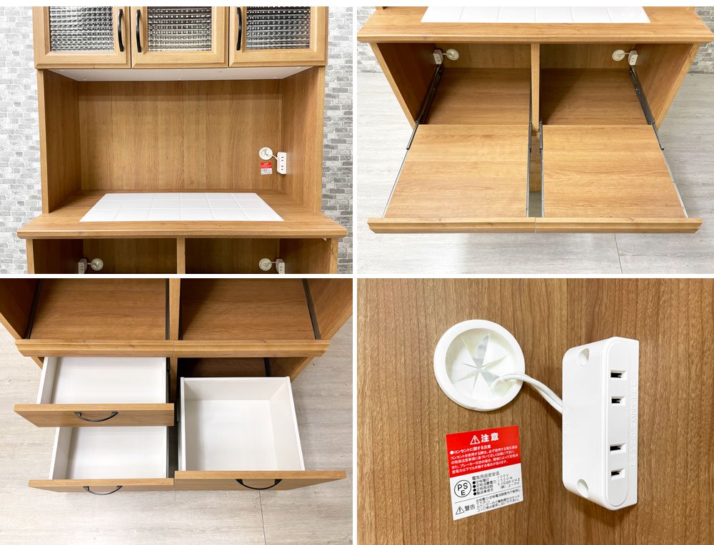食器の収納は勿論、電子レンジや炊飯器の設置も出来る機能的な造り。天板部のタイルは耐熱性・耐久性に優れ、調理中の補助台としても活躍出来そうです。