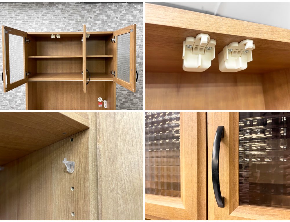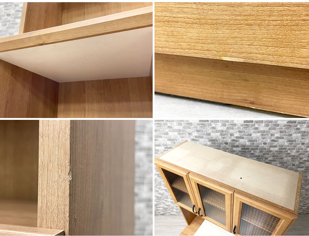 明るいナチュラル色のウッドフレームにチェッカーガラスの開き扉とホワイトタイルを組み合わせ、金属ハンドルがアクセントになったレトロスタイルの食器棚。カフェスタイルの家具や雑貨を得意とする同社ならではのデザインは、周りの木製家具やフローリングともよく溶け込み、インテリアコーディネートに不安のある方でも安心してお使い頂けます。