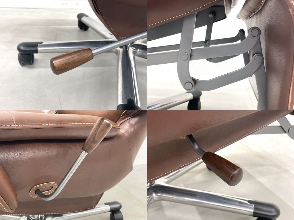 身体に触れる部分は上質な牛革をはり、レバーノブにも拘りを感じるオーク材をあしらった高級感のあるデスクチェア。