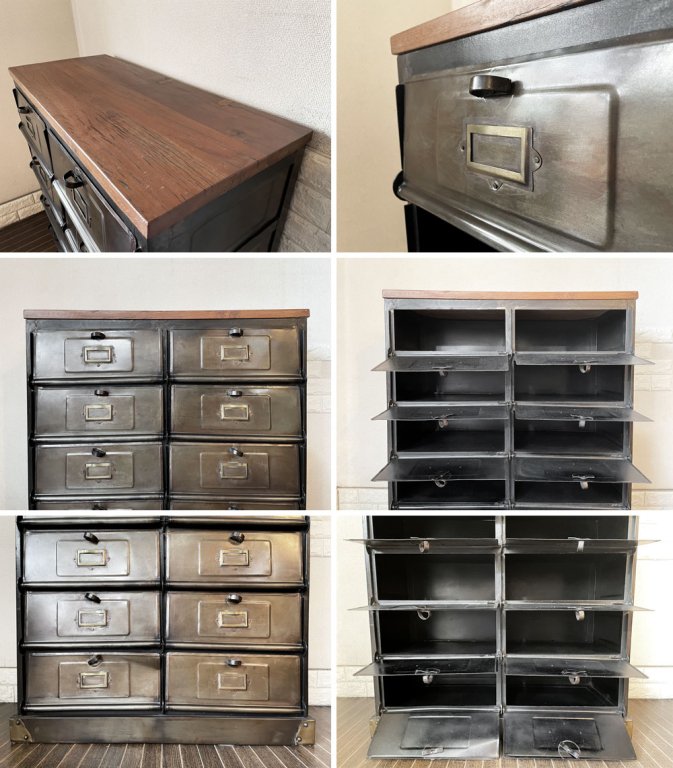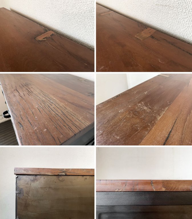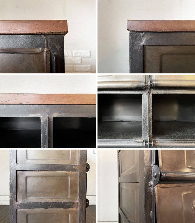 こちらは、エイジング加工が施されたお品物です。木部の擦れや傷、若干の反りのほか、全体にくすみや錆、色ムラ、ペイントロス、取り切れない汚れ等が見受けられます。また扉には若干の歪みが生じ、特に最下段向かって左側のダメージが目立ちますので、詳細画像をご覧下さいませ。