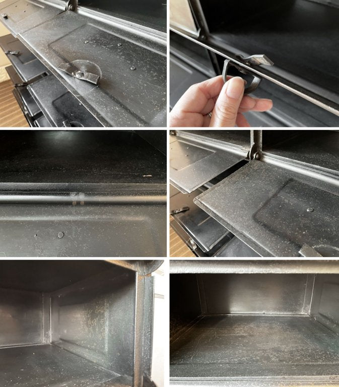 なお、ハンドルには開閉時のロック等はもともとなく、ストッパーは固定されません。開閉は問題なく行えますが、留め金具のゆるみもあるため、特に閉時には確実に開かないことを確認していただくことをお勧めいたします。その他、ご使用に支障となるダメージはございません。インダストリアルの風合いをお楽しみ頂きながら、これからもまだまだ実用可能なコンディションを保っております。