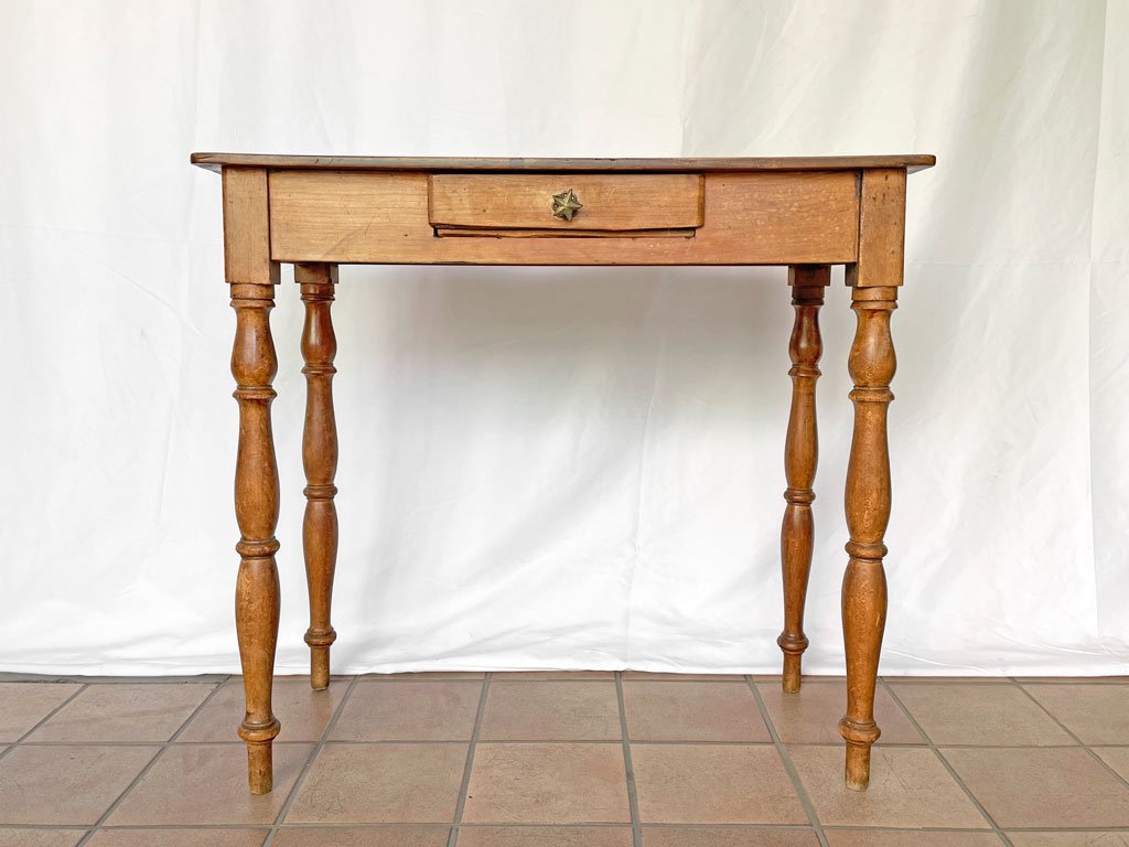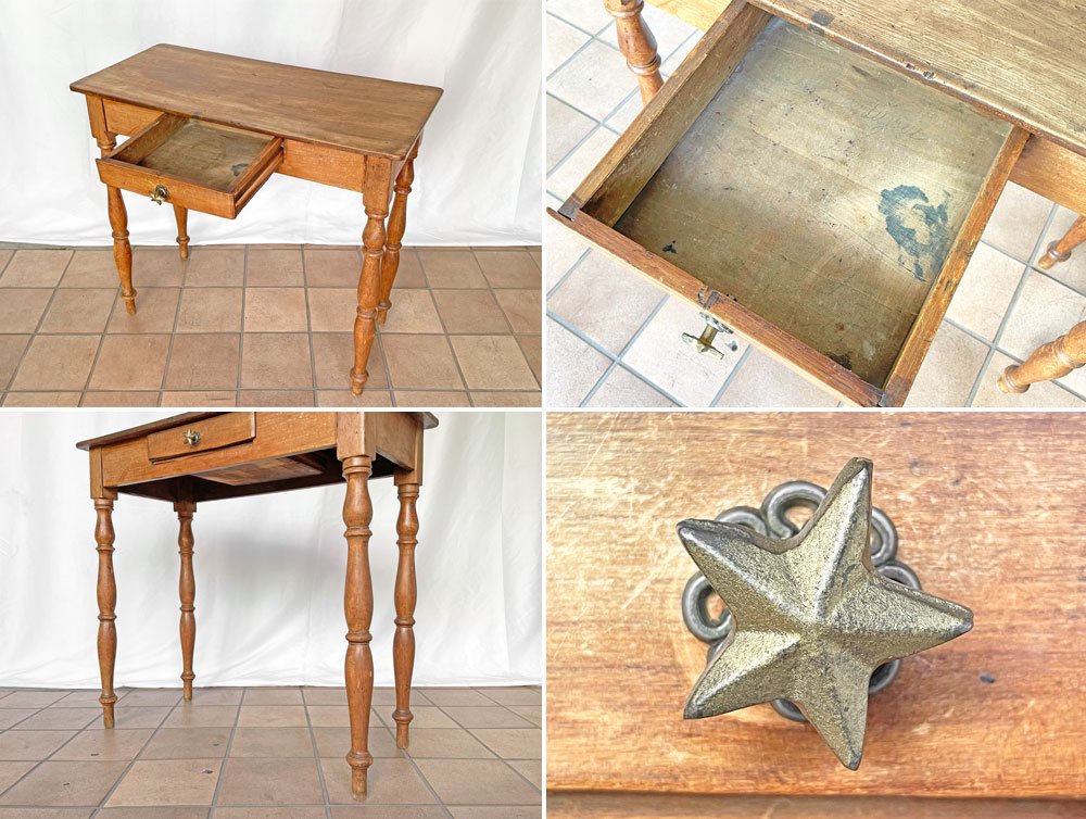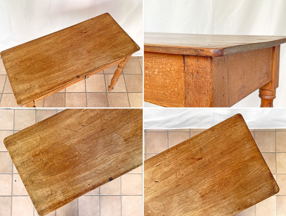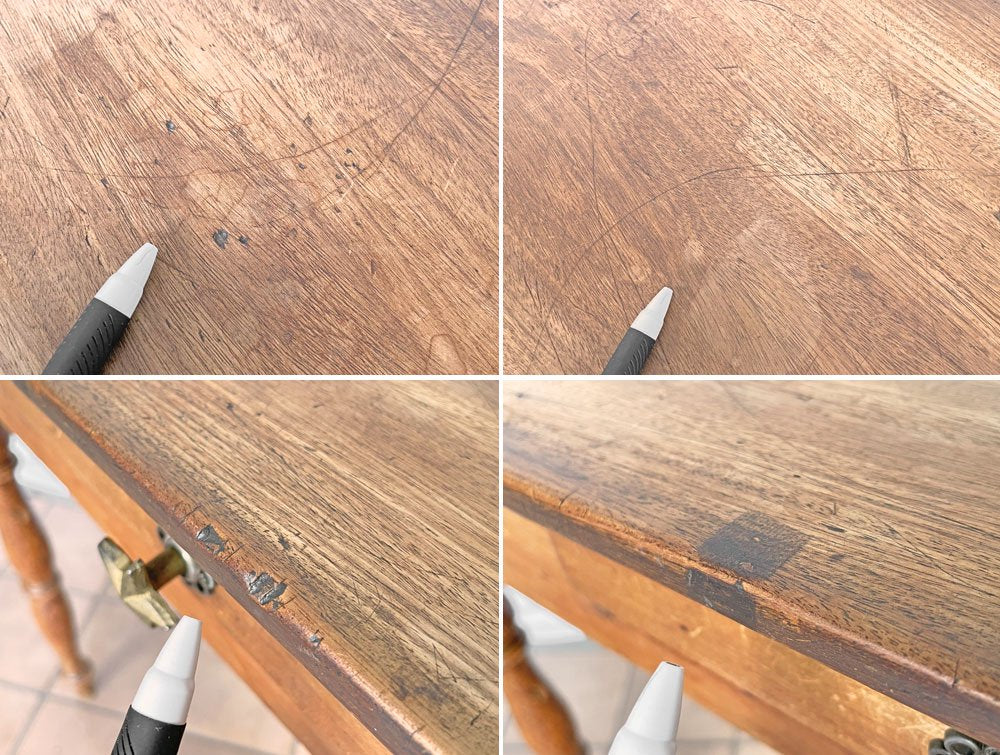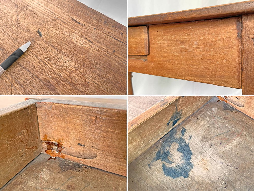 こちらはビンテージ品となります。使用に伴う擦れ傷や打痕、スクラッチ、線傷、細かなヒビ、染みや着色などが全体的に散見され使用感がございます。また、引き出しの戸板裏側には木の割れによる釘が手にあたらないよう、接着剤で補修された痕がございます。