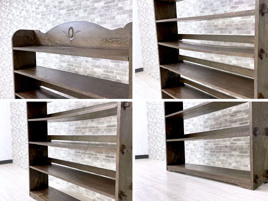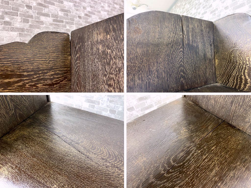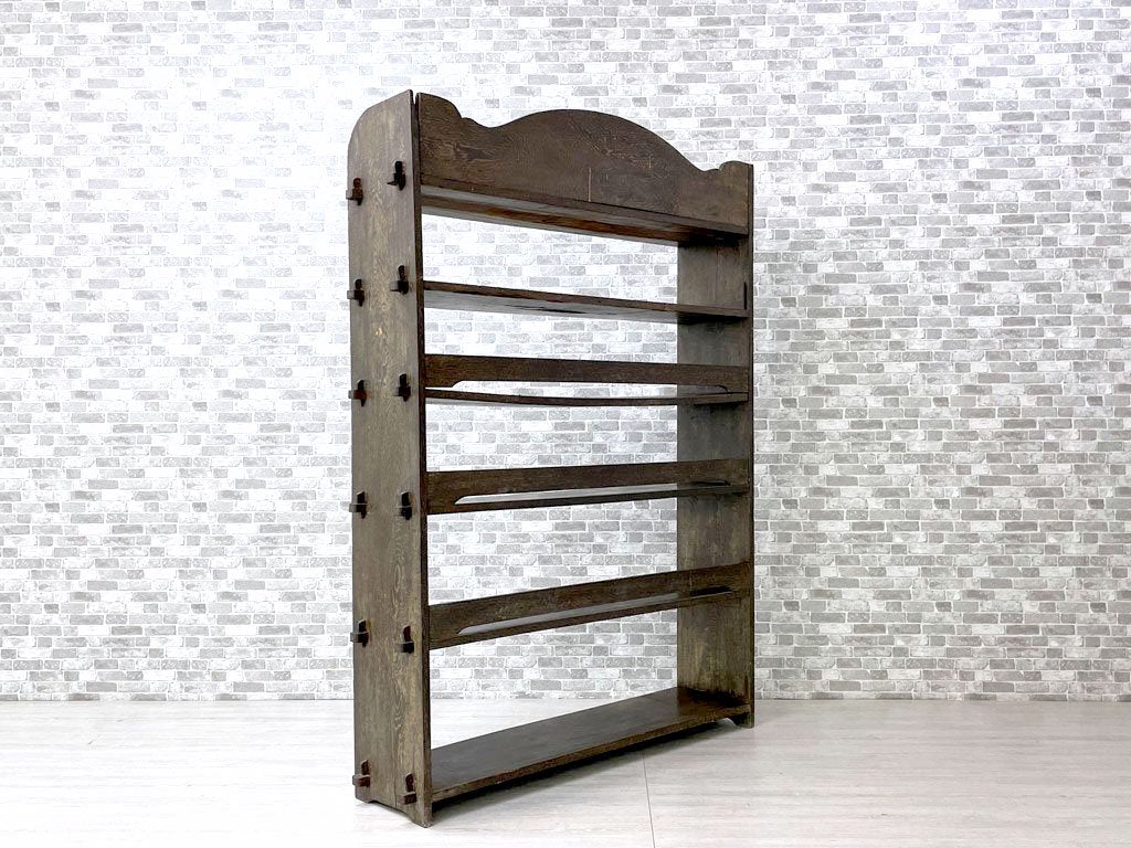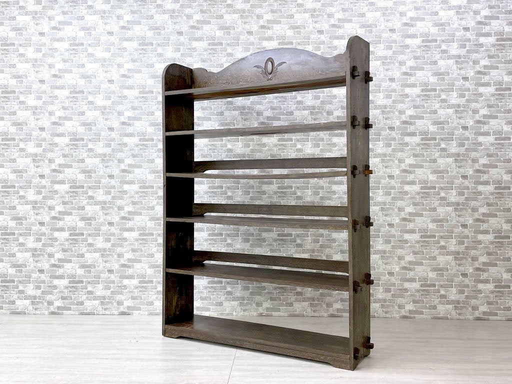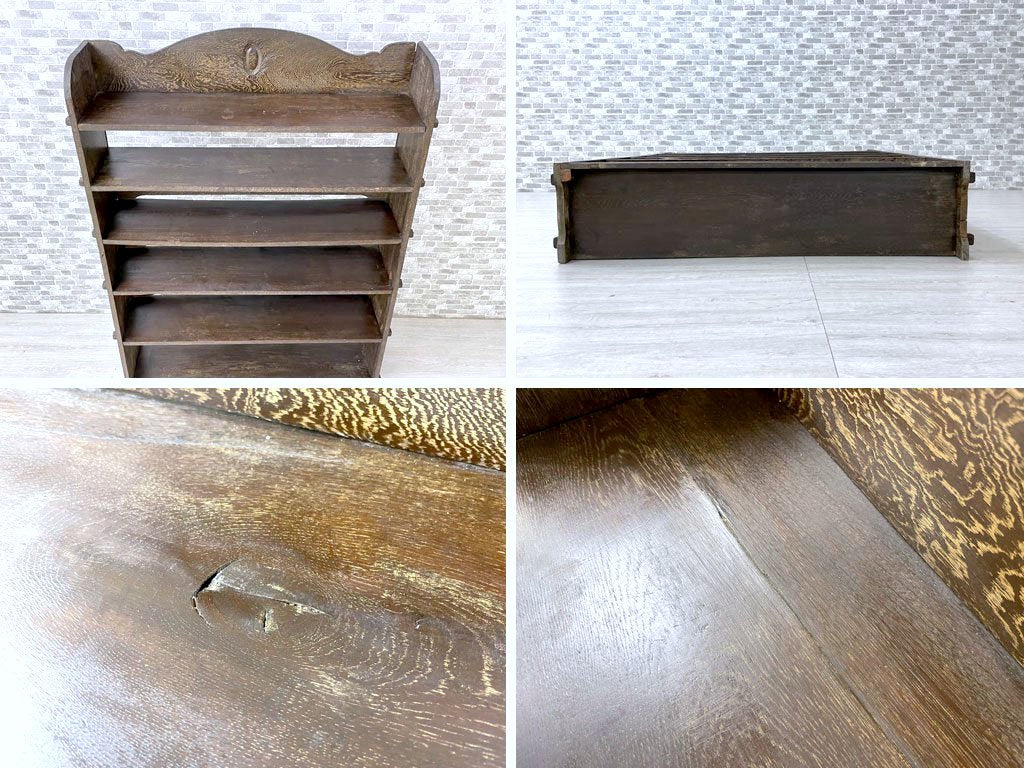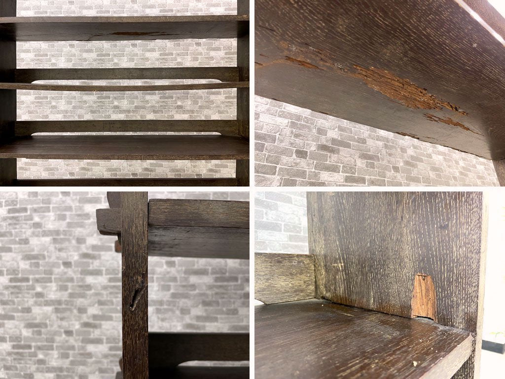 などが全体的に見受けられ、時代を感じさせるコンディションとなっております。ビンテージの風合いとしてお楽しみ下さいませ。また一部楔が既存のものではないものに変えられていたり、最上段と最下段の背板が欠品していたり、棚板が一部湾曲していたりしております。