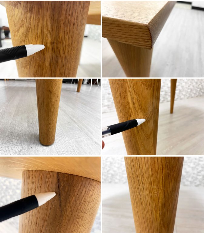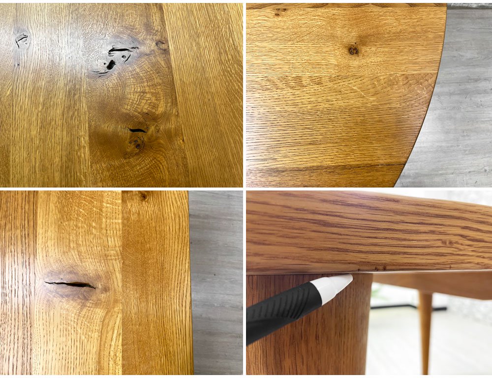 使用に伴う僅かな線傷や打痕、擦れ、落としきれない染みはございますが、天板は当店にてサンディング後オイル仕上げさせて頂いておりますので、比較的良好なコンディションに仕上がっております。また、天板の節は元々の仕様となります。その他ガタツキやグラつきはなく、中古品としては概ね良好なコンディションを保っております。