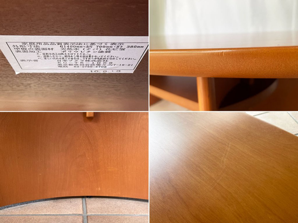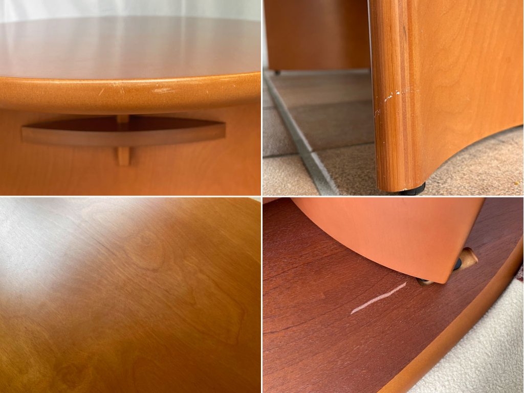 使用に伴い天板に擦れや線傷、また脚に一部表面の亀裂等やや使用感が感じられますが、大きく目立つダメージはございません。また構造上若干の横揺れがございますが、使用する上で問題となる程ではございません。その他使用上問題となるダメージも見受けられず、これからも安心してお使い頂けるコンディションを保っております。