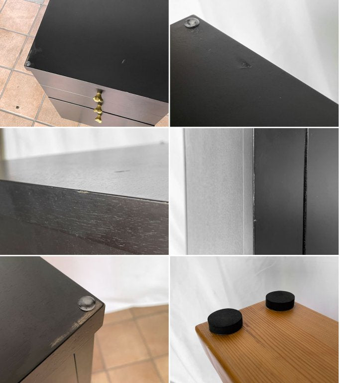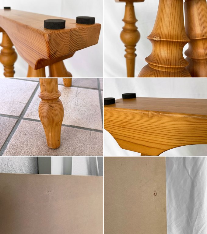 使用に伴い土台に打痕や擦れ、天板裏に線傷が散見されますが、美観を大きく損ねるものではございません。土台には高さ調整の為クッションを貼り付けている他、天板の反りと土台の若干の高さの違いにより天板と土台の間に僅かに隙間が出来ますが、大きなガタツキ等は無く使用に問題はございません。これからも問題なくご使用頂けるコンディションです。