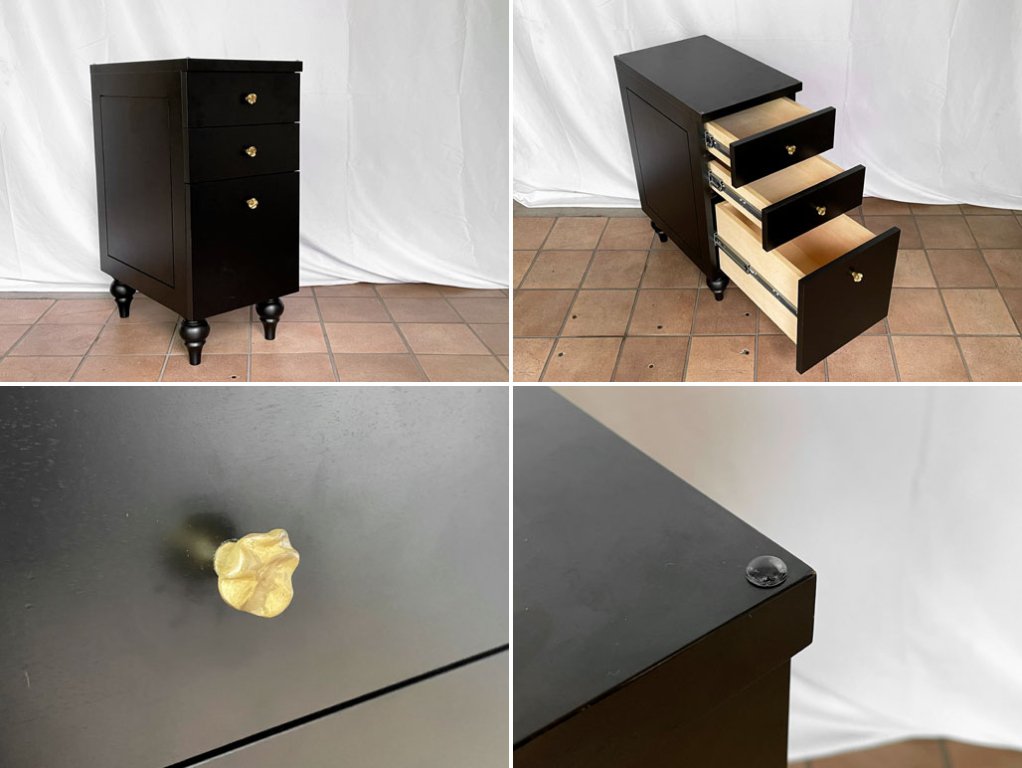 木製キャビネットはブラックのシックなカラーリングとビンテージゴールドのハンドルがマッチしたお洒落なアイテムとなっております。