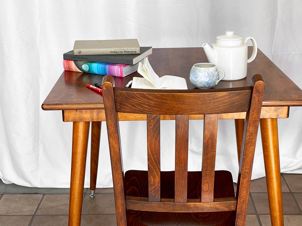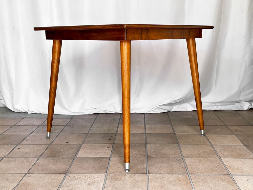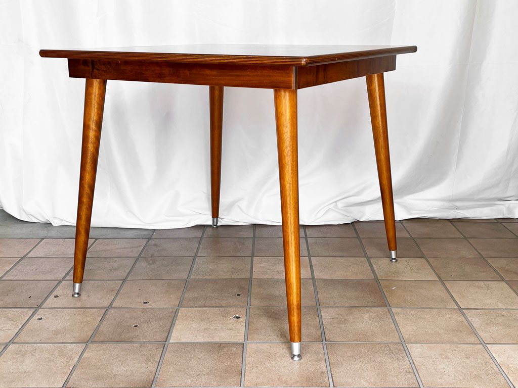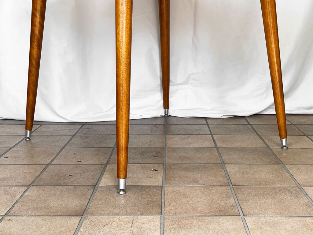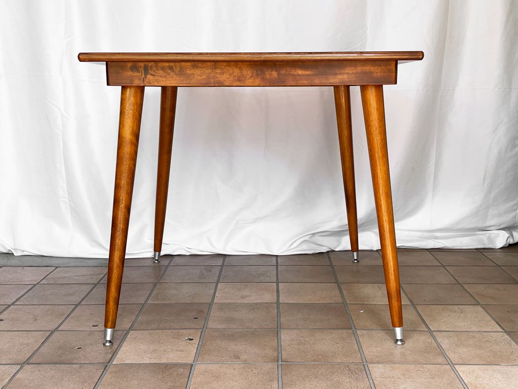 合板の風合いをそのまま天板にした飾らない佇まいと、飴色の艶を持たせたビンテージな質感のカラーリングがなんとも魅力的なアイテムとなっており、ナチュラルなテーパーを描く脚部とのバランスも良くどのような空間にも合わせやすいダイニングテーブルとなっております。