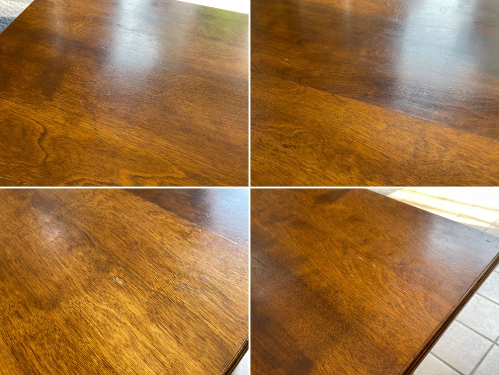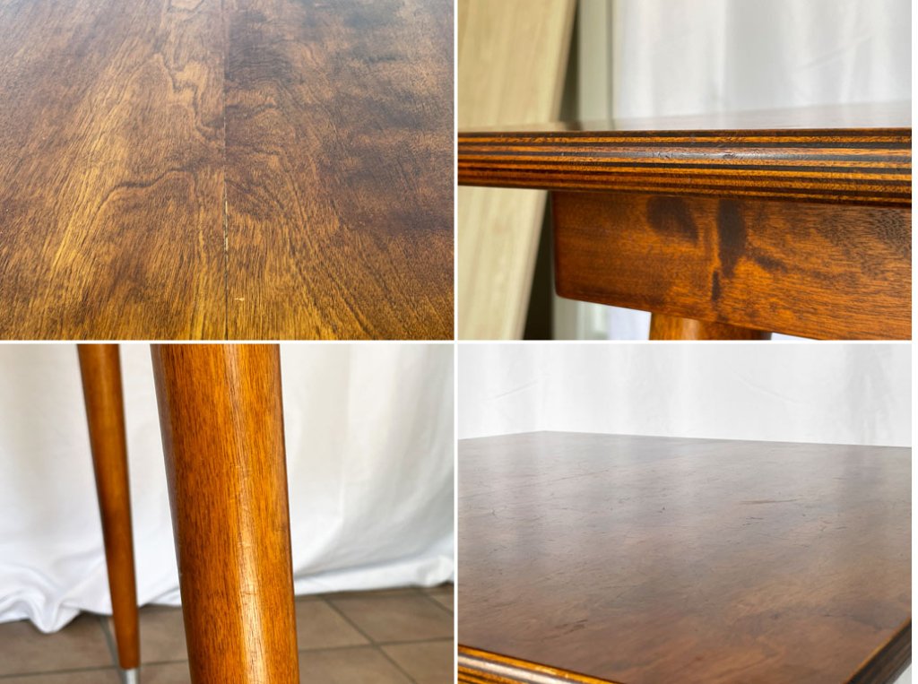 使用に伴い天板には全体的に細かな傷や打痕が確認できる他、細かな塗装の剥がれや中央の材の繋目が僅かな浮き上がり等が見られやや使用感が感じられますが、テーブル自体の雰囲気と良く馴染んでおり美観を大きく損ねる事はありません。その他ガタツキや割れ等の使用上問題となるダメージも見受けられず、これからも気持ち良くお使い頂けるコンディションです。