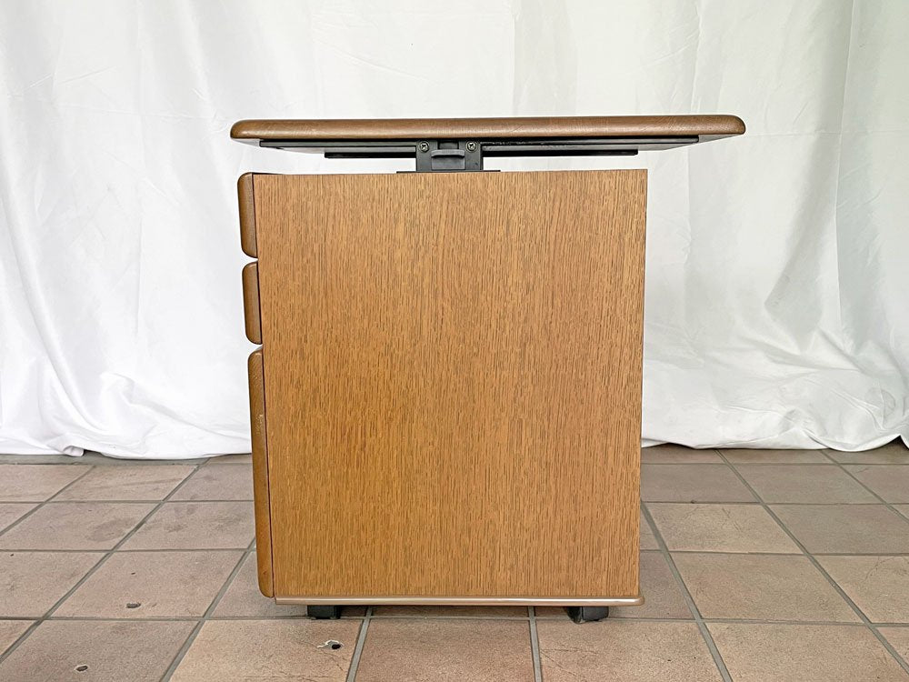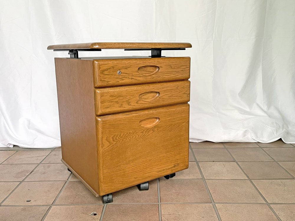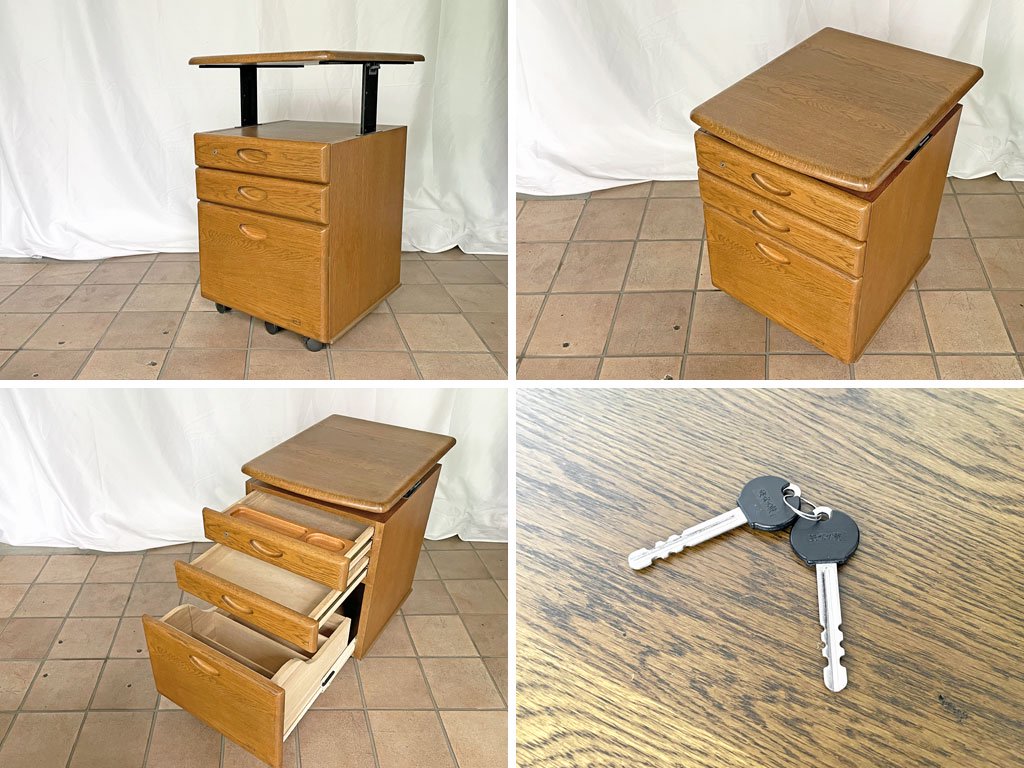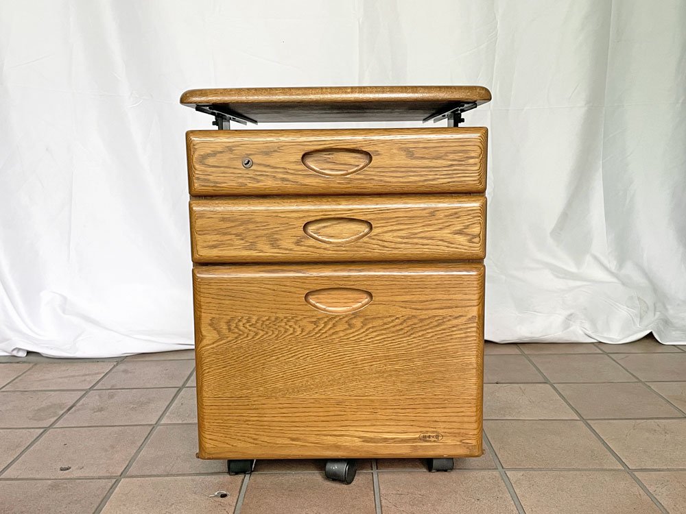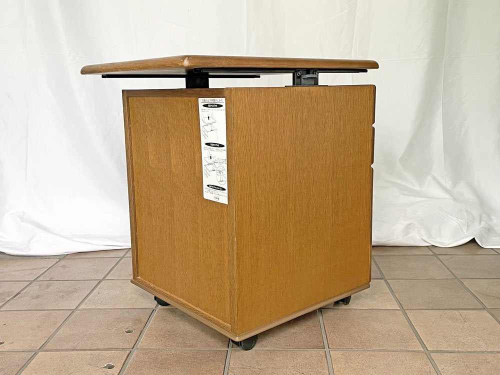 浜本工芸 デスクキャビネット ワゴン 3段 引き出し キャスター 昇降機能付き天板 鍵付き ナラ材 国産家具 ◇