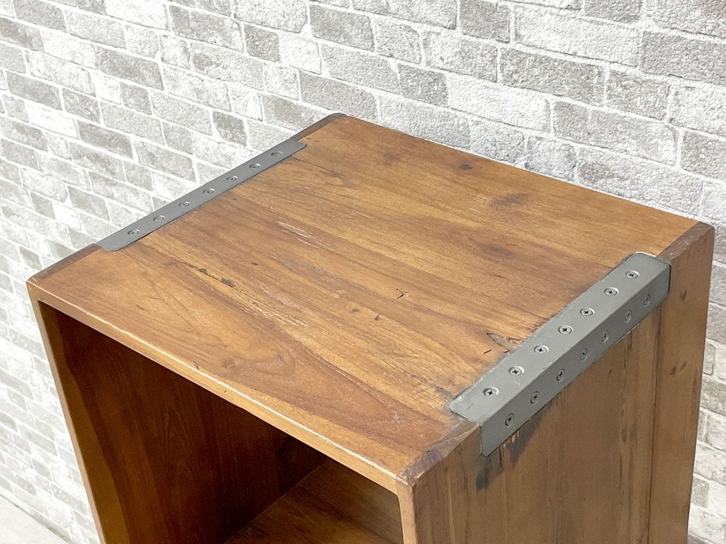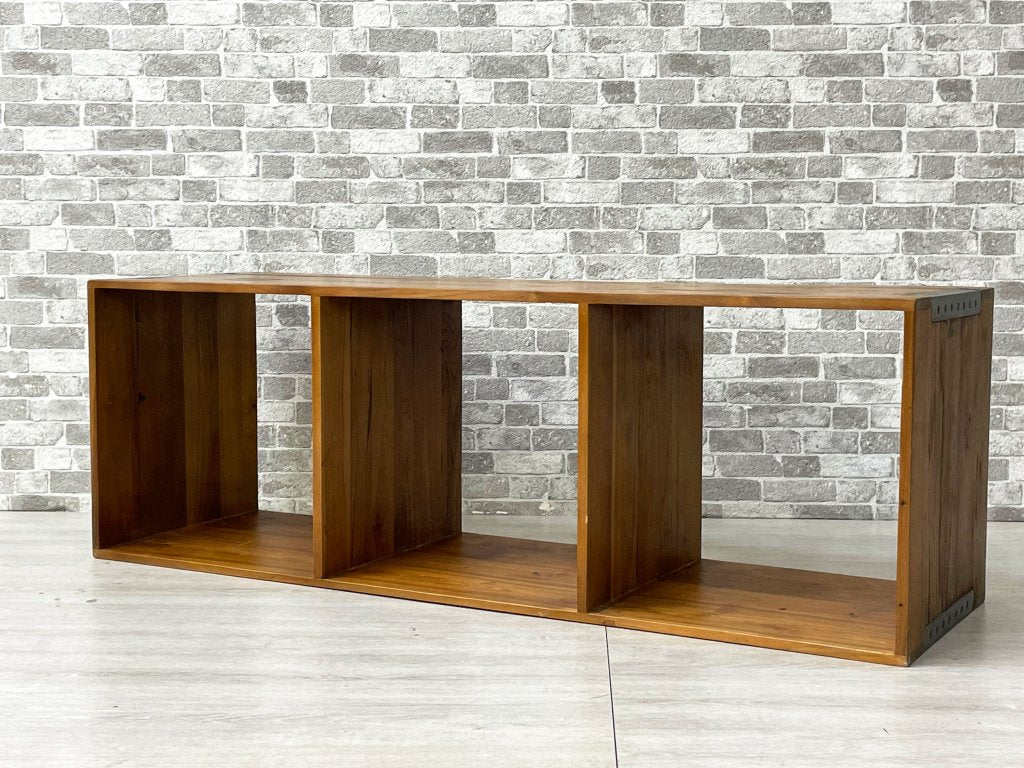 チーク古材特有の色ムラや手触りを活かしたウッドフレームにブラック色の金属フレームを組み合わせ、程よく全体を引き締めるメリハリの効いた造り。縦横自由に使えるオープンシェルフは、本棚や飾り棚、AVボードやローボードとして。また同シリーズのトロイボックスやお好みの木製ボックスやアイアンボックス、ラタンバスケット等を加えて引き出し収納としても活躍出来ます。
